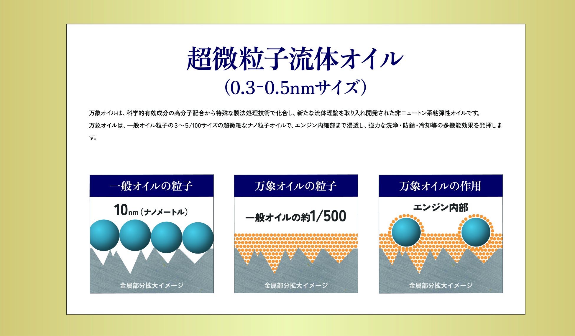 万象は、科学的有効成分の高分子配合から特殊な製法処理技術で化合し、新たな流体理論を取り入れ開発された「非ニュートン系粘弾性オイル」です。万象オイルは0.3~0.5nmの超微細なナノ粒子オイルで、エンジン内細部まで浸透し、強力な洗浄・防錆・冷却等の多機能効果を発揮します。