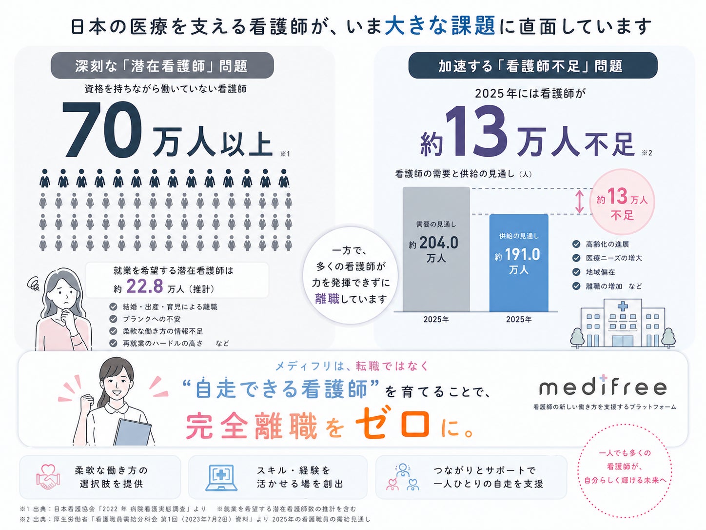 転職支援サービスは数多く存在しますが、その多くは「次の職場を紹介する」モデルにとどまり、根本的な働き方の悩みを解決するには至っていません。メディフリは、転職ではなく"自走できる看護師"を育てることで、完全離職を未然に防ぐ"社会的セーフティネット"としての役割を担うことを目指しています。