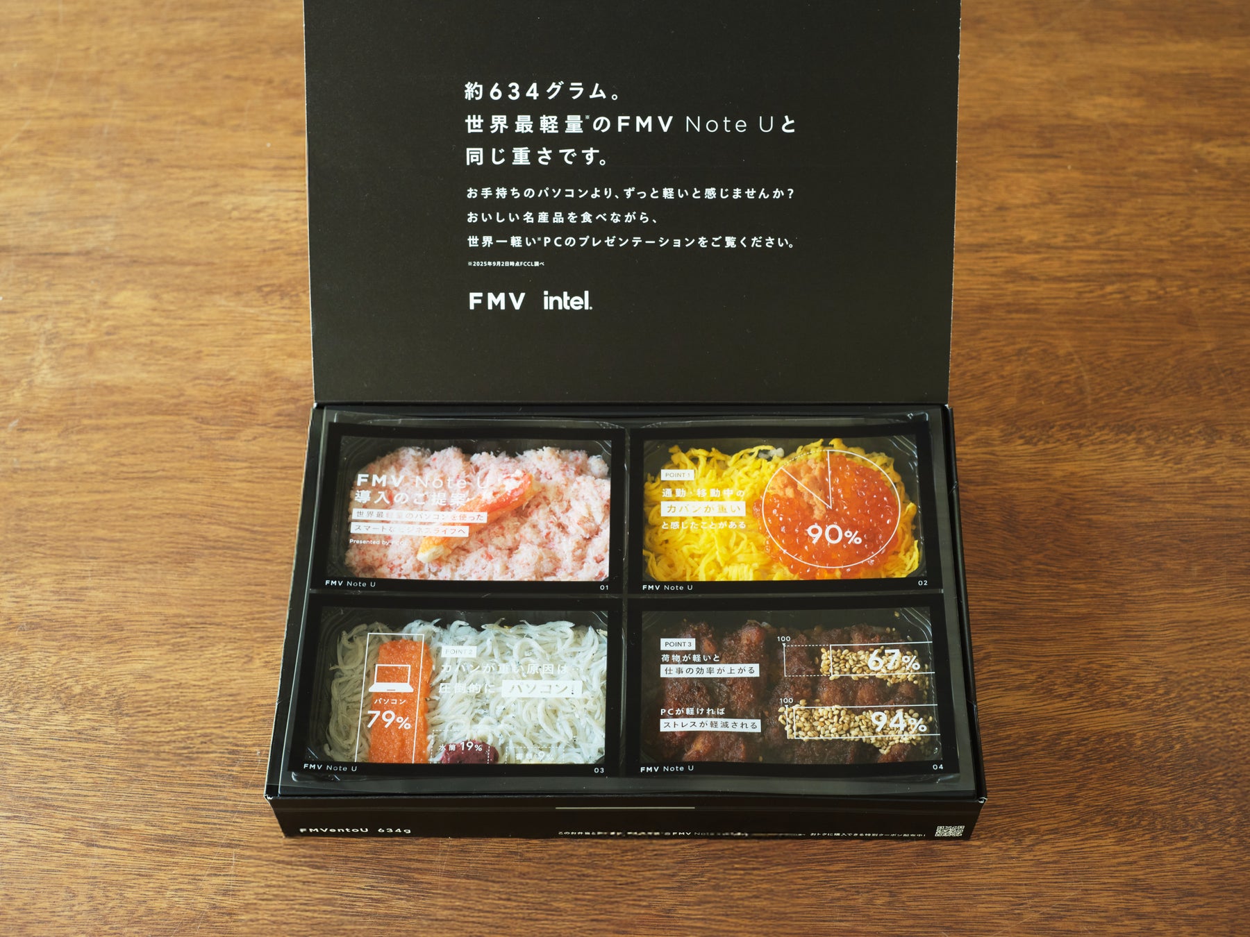 「FMVentoU」は、世界最軽量※1のパソコン「FMV Note U(UX-K3)」と同じ約634gのお弁当となっています。お弁当の中身は「パソコンの重さに関する実態調査」の結果を食材で表現し、食べるのはもちろん、見ても楽しめるお弁当となっています。