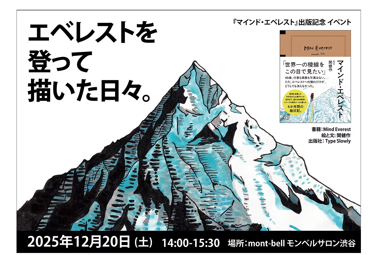 写真家・関健作(せき けんさく)は、2025年12月20日(土)、エベレスト登頂の記録をまとめた書籍『マインド・エベレスト』(発行:Type Slowly)を発売いたします。また、発売を記念し、同日14時よりモンベル渋谷店サロンにて、トークイベントを開催いたします。