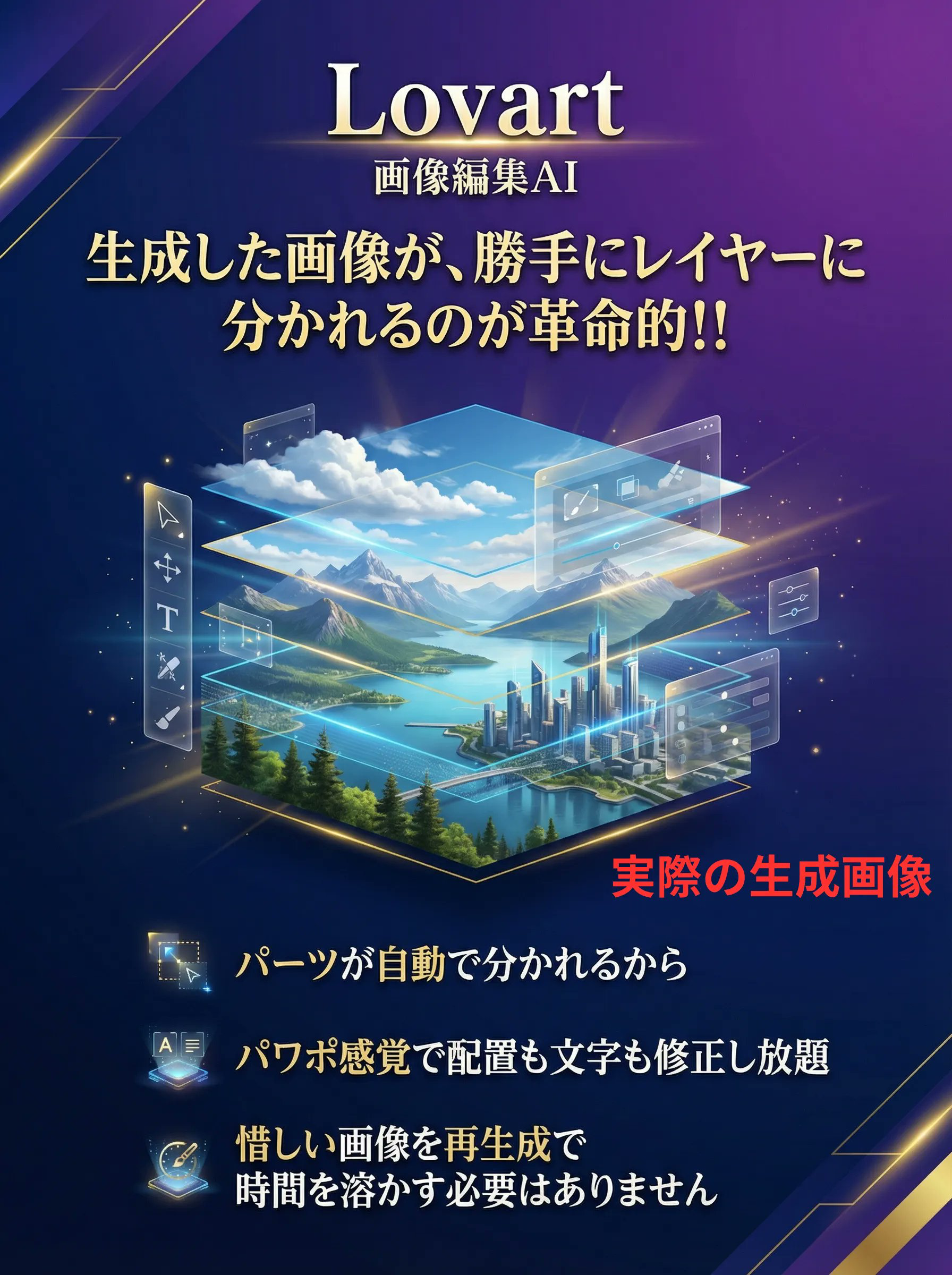 LovartのAI解析技術により、Nano Banana Proで生成された高精細な画像を「前景・背景・テキスト」などのレイヤー単位へ即座に分解・構造化します。