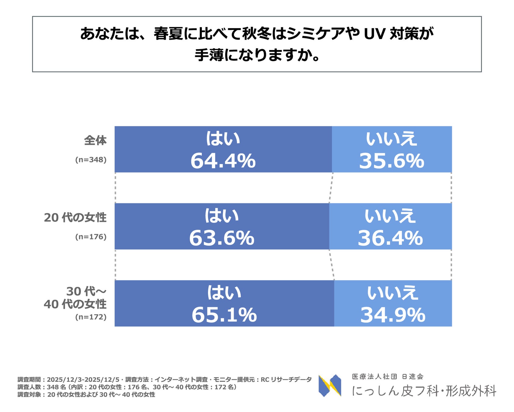 夏場は徹底される紫外線対策も、冬になると多くの女性が手を緩めてしまう傾向にあります。しかし冬は、夏のダメージが表面化し、乾燥で色素沈着するリスクがある季節です。 また、現在の肌状態は「冬のケア」だけでなく、「若い頃からどの程度ケアを継続してきたか」という蓄積の結果でもあります。そこで、医療法人社団 日進会 にっしん皮フ科・形成外科は、20代と30代~40代の女性を対象に、「肌のシミケアに関する世代別意識調査」を実施しました。
