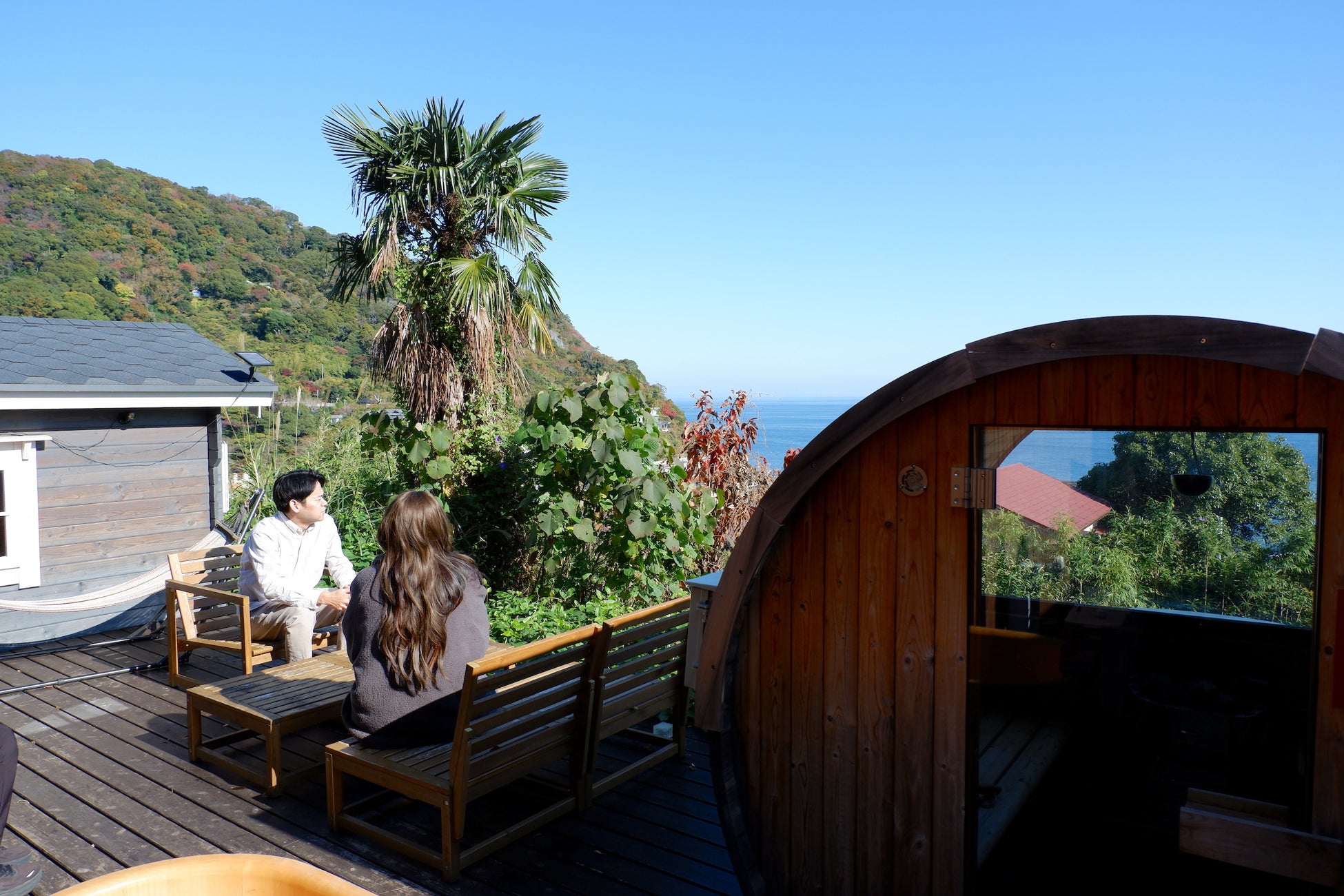 ・サウナ・外気浴・水風呂付き:相模灘を望むバレルサウナ、露天水風呂、ウッドテラスにハンモックやソファを備え、リラックスと集中を両立。