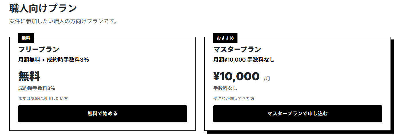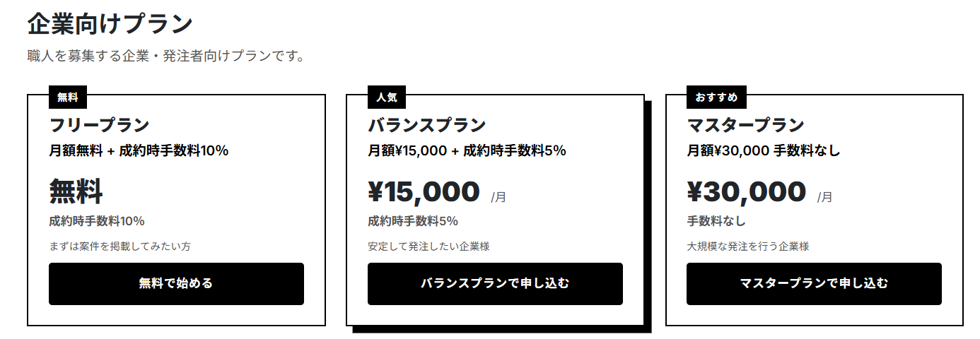 職人、企業ともに初期費用無料で使える「フリープラン」のほか、月額制で成約時の手数料が無料または格安のプランもあります。月額制のプランは、受注額が多い職人や、安定して発注したい企業向けです。