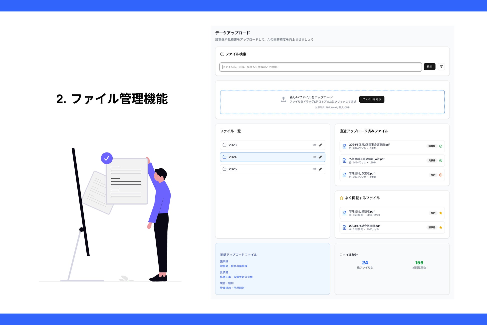 また、ファイル管理機能にアップロードされた議事録・見積書・収支報告書などを学習し、使うほど各マンションに最適化された回答が可能になります。