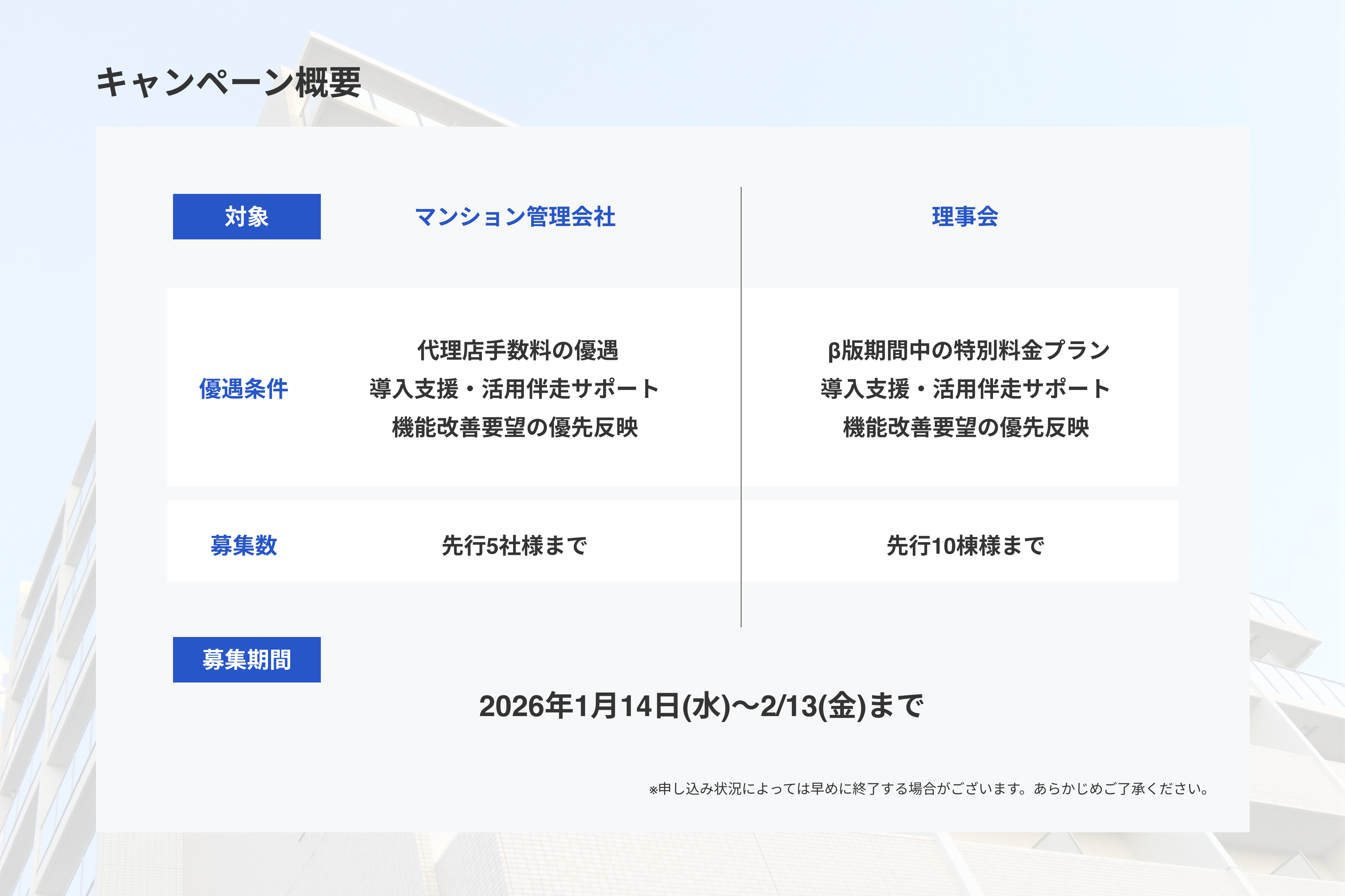 なお、β版においても、今年4月からのマンション関係法の改正内容にも対応予定です。