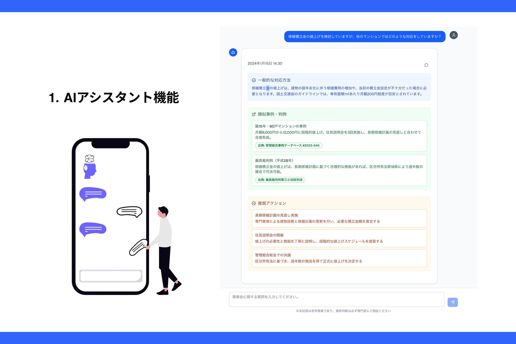 ・AIアシスタント風UIで、理事会運営・法令・管理実務に関する質問に即時回答