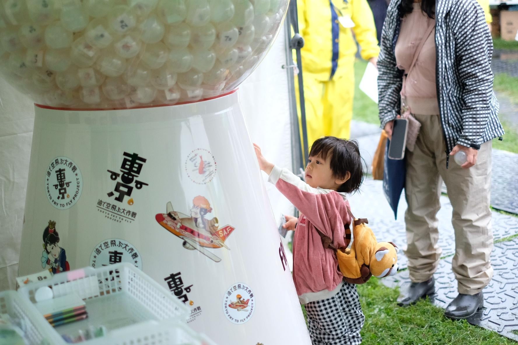 「Tokyo Fry to Fly Project~油で空飛ぶ大作戦~」の象徴的コンテンツとして、「フライガチャ」が都内各地のイベント会場にて設置されました。「フライガチャ」は、都民の皆様が家庭で回収した廃食用油を持参することや、「SAFが分かるVR」を体験頂くと、1回まわすことができるもので、参加者には、ステッカーや缶バッジなどの参加特典をプレゼントしています。フライガチャの景品はFry to Fly Projectに参加している企業や自治体などが協賛しており、企業や自治体が市民の行動変容に貢献できる機会を創出するものです。羽田空港「空の日」フェスティバル2025、あだち区民まつり「A-Festa 2025」、東村山市エコライフフェアなど、都内各地のイベントにて登場し、ガチャを回す体験を通じて、資源循環やSAFへの理解を“楽しみながら”深められる仕掛けとして、子どもから大人まで幅広い層に人気を博しました。