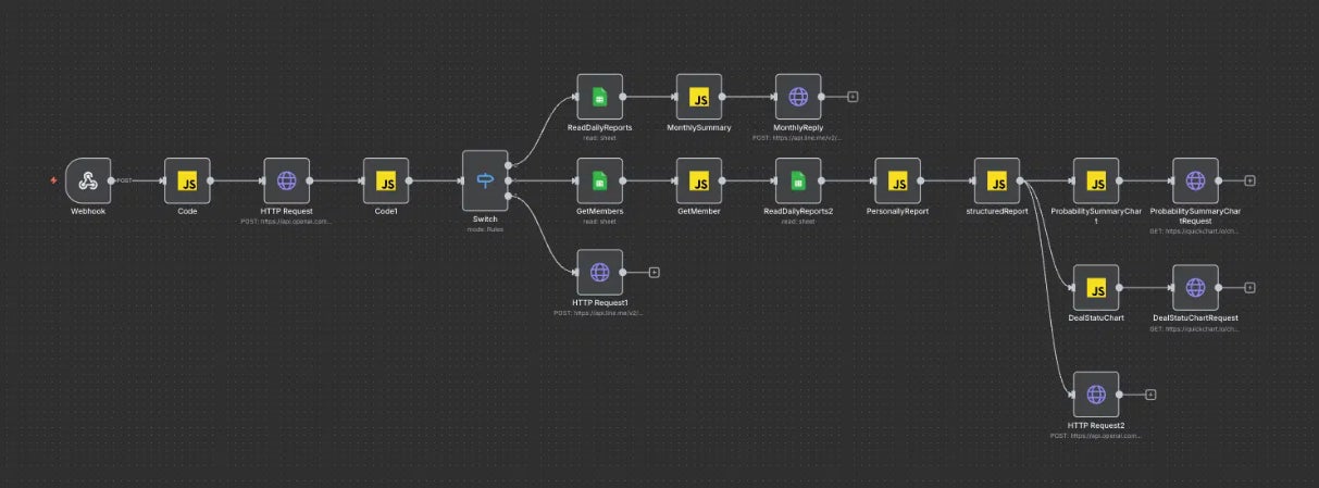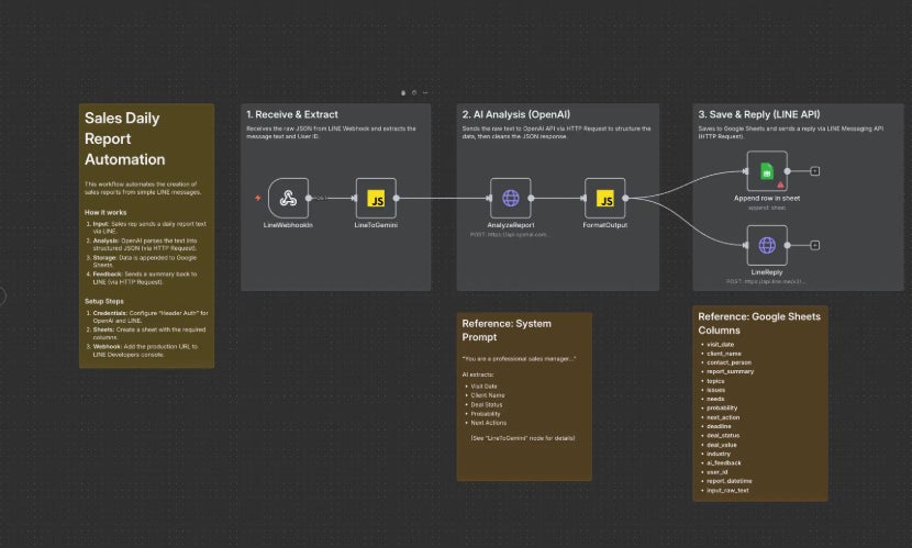 【事例1】営業日報の完全自動化(月10時間削減) 営業担当者がLINEで日報テキストを送るだけで、AIが内容を構造化・分析し、Google Sheetsに自動記録。さらにサマリーをLINEに即時返信します。