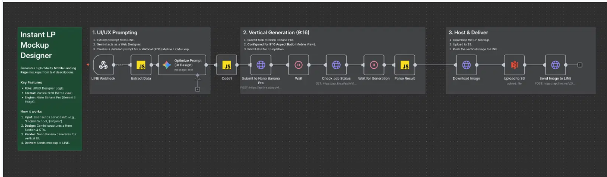 【事例3】LPモックアップ自動生成(制作期間を3日→数分に) サービス情報を送るだけで、AIがUI/UX設計から画像生成までを行い、プロ品質のモックアップを即座に納品します。