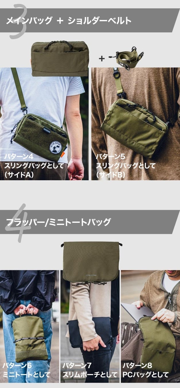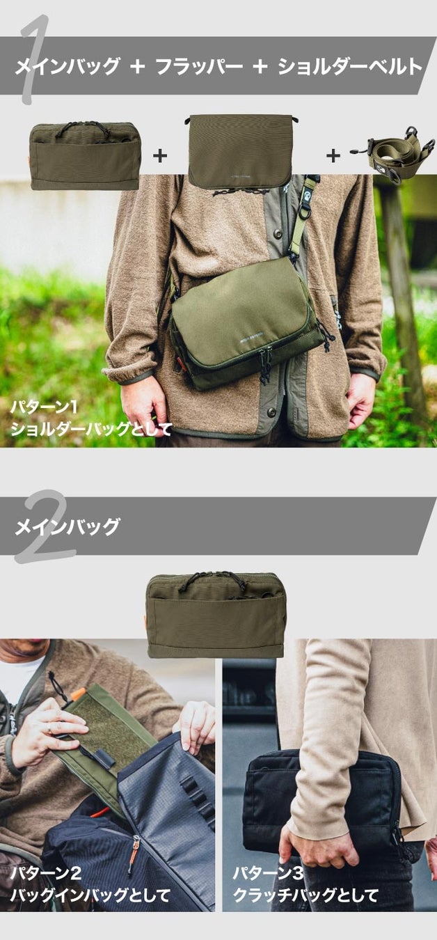 Node Oneは、1つのバッグから様々な形状で使用することが可能です。取り外し可能なフラップ部分をサコッシュやミニトートバッグとして使うことも可能で、その使い方は多岐にわたります。