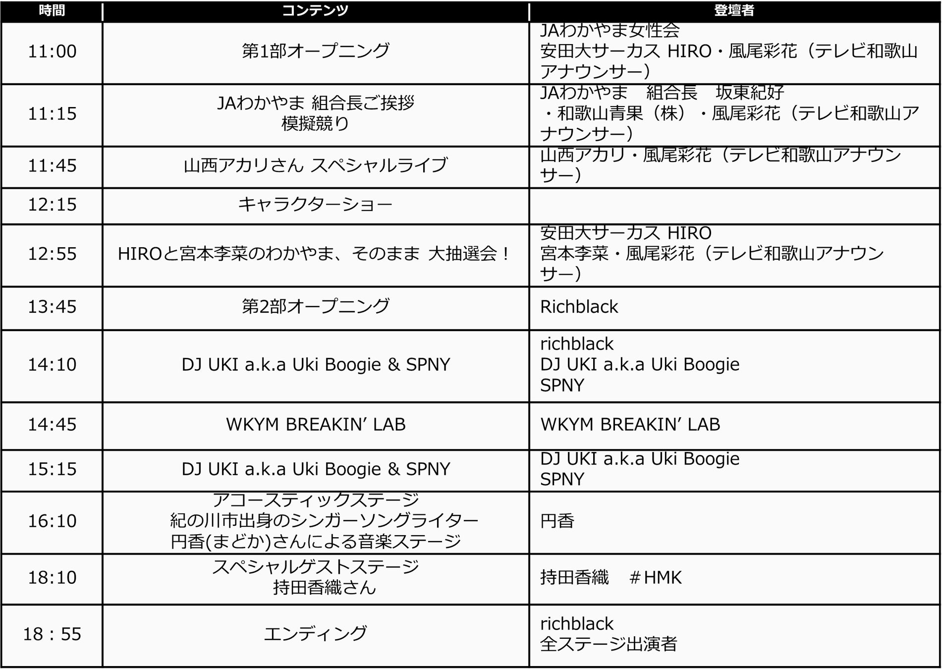 内容 :オープニング / 模擬競り / 山西アカリ(「有田みかんアンバサダー」)スペシャルライブ / HIROと宮本李菜の「わかやま、そのまま」大抽選会/DJ UKI a.k.a Uki Boogie & SPNY(DJステージ)/WKYM BREAKIN’ LAB(ダンスショーケース)/ 円香(アコースティックステージ)/ 持田香織(スペシャルゲストステージ)/ エンディング