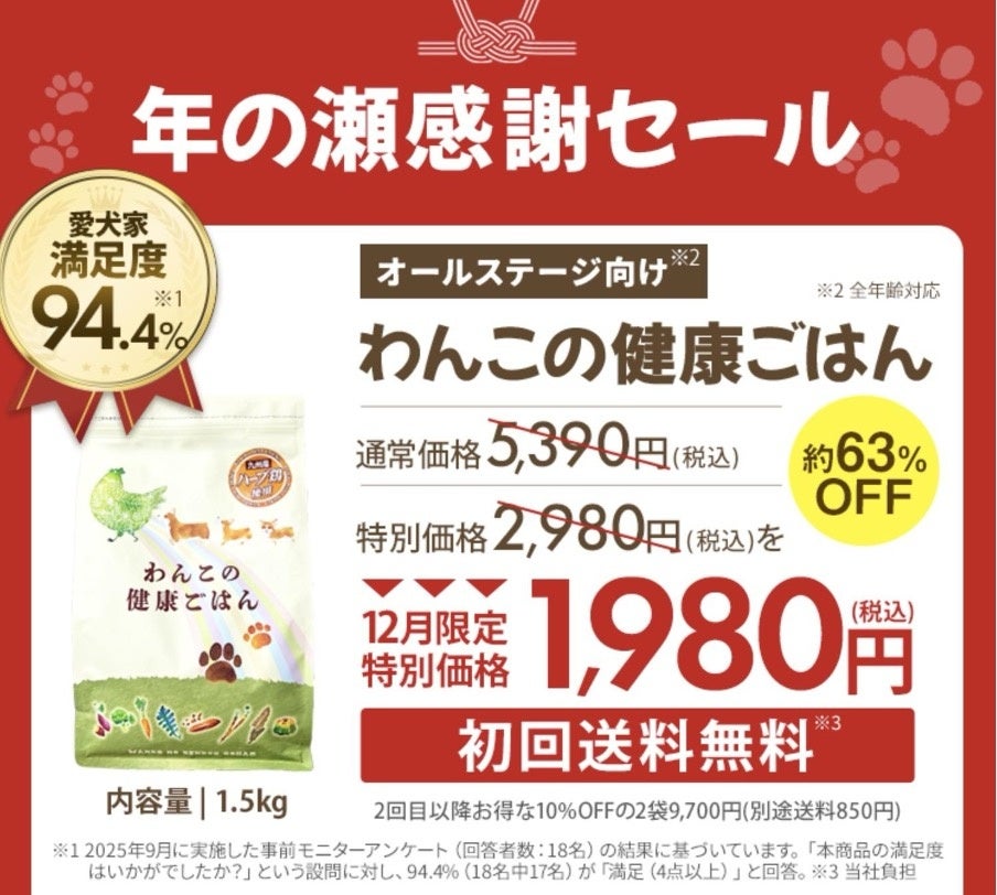 株式会社アイコン(本社:福岡県大牟田市、代表取締役:竹内 茂美)は、愛犬の健康を第一に考えたプレミアムドッグフード「わんこの健康ごはん」の年の瀬感謝セールを12月限定で実施いたします。