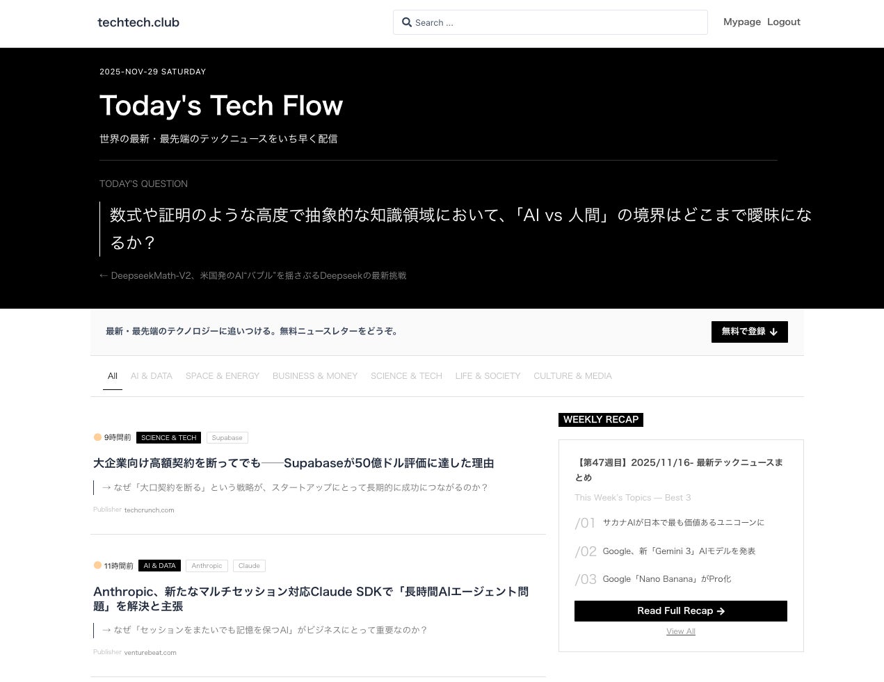 techtech.clubは、「ニュース → 問い → クリエイター」という三層構造で、テクノロジーの本質を掴むための新しい情報体験を目指して設計しました。