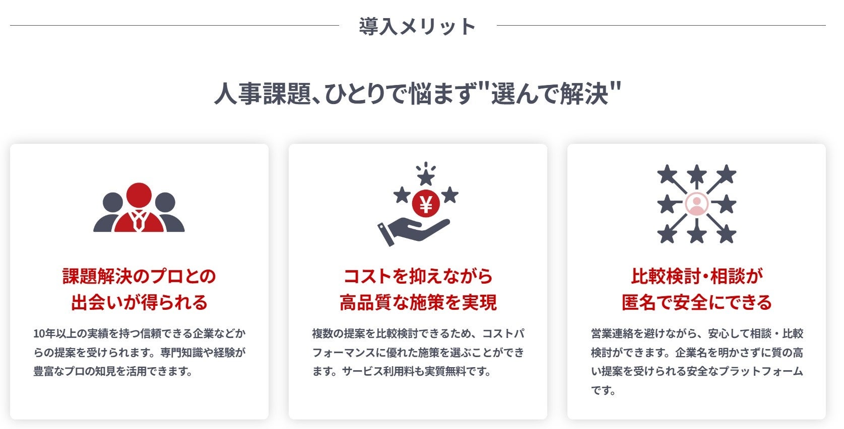 比較検討まで完全無料で利用できる点や、提案段階では企業名を開示しない匿名設計を採用している点を特徴とし、企業が心理的な負担なく組織課題の解決策を検討できる環境づくりを目指しています。