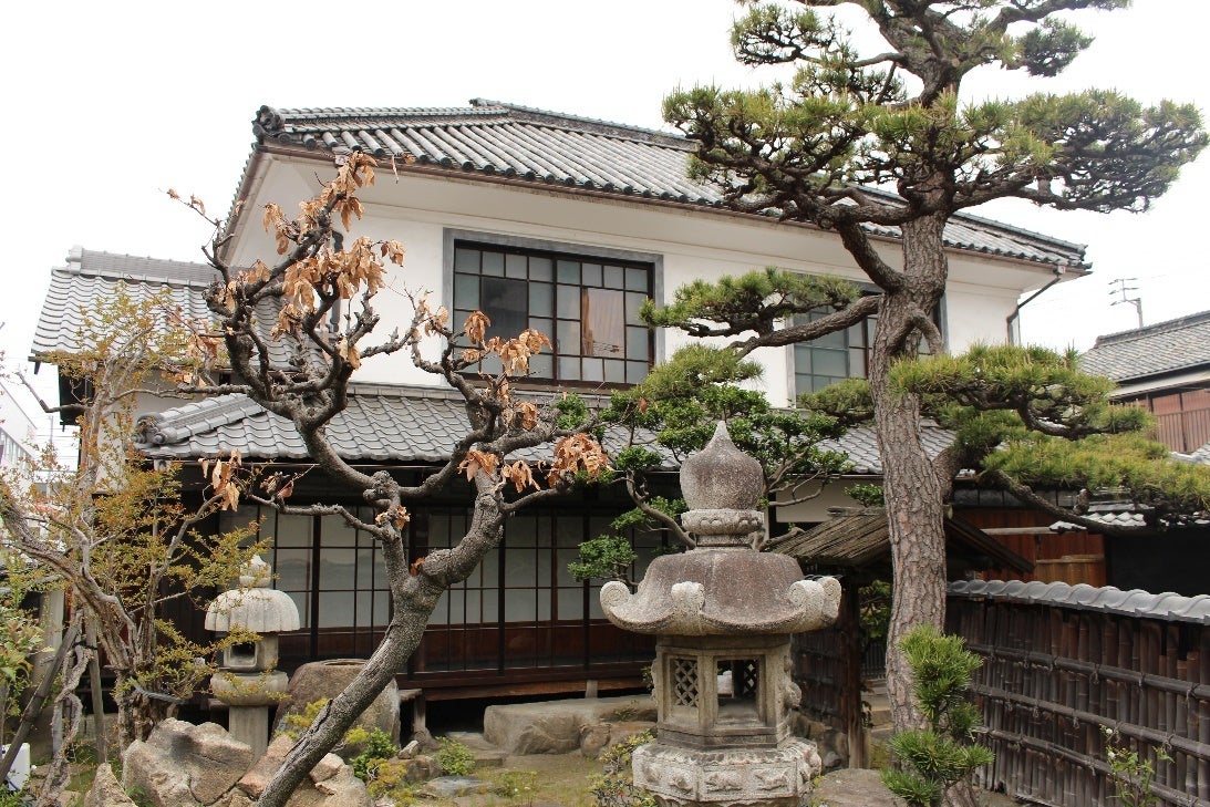 会場となる旧石川家住宅主屋は、大正前期に建てられた国登録有形文化財です。坂出市の歴史的な海岸線の名残を感じられる元町に佇み、白漆喰壁、大きなガラス建具、松竹梅の意匠を施した鬼瓦など、当時の先進性と伝統美が見事に調和した建築が特徴です。 内部には続き座敷や茶室、明るい縁側があり、かつて塩田越しに瀬戸内海を望んだ暮らしの面影を今に伝えています。白漆喰壁や大きなガラス建具は、当時の富裕層の生活様式を物語る貴重な遺構として、香川県に広がった近代和風建築を知る上で重要な建物とされています。