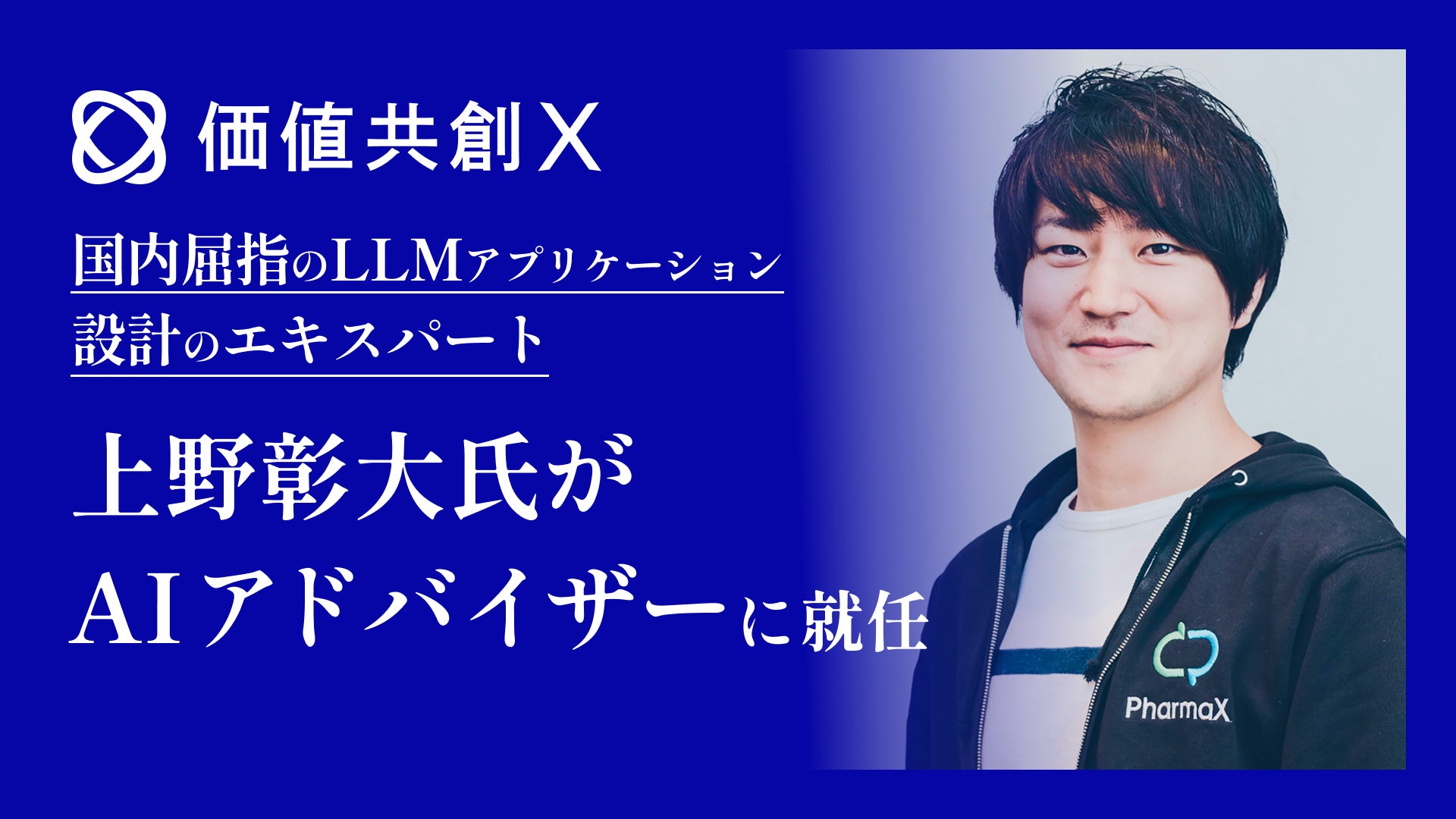 株式会社価値共創X(本社:東京都中央区/代表取締役:細野雄紀、以下「価値共創X」)は、2025年12月1日付で、PharmaX株式会社 取締役 CTO の上野彰大氏がAIアドバイザーに就任したことをお知らせいたします。