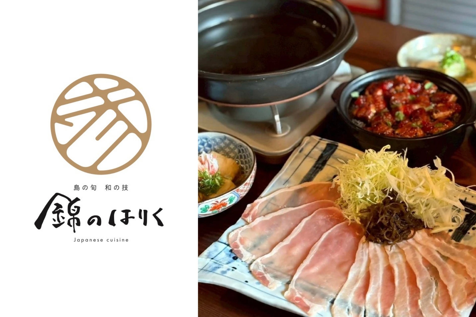 『錦のはりくは』は、東京ミシュラン星付きレストランで修行したシェフと元宮廷料理人が手掛ける島の食材と和の技法を取り入れた前菜や逸品料理を多彩にご提供しております。仕込みと低温調理に10時間以上かけた奇跡のとろける食感、そのままでも魅了される希少なあぐー豚の「1秒しゃぶしゃぶ」のほかに、「沖縄の伝統飯あぐー豚のクファジューシー土鍋飯」「与論島のグルクンと季節野菜の飯」、「厳選石垣牛の瞬間しゃぶユッケ」「ラフテー〜琉球王国の味〜」「やんばる鶏炭焼き」「ジーマミ豆腐とズワイガニの揚げ出し」「沖縄県産のもずく天ぷら」など、こだわりの料理で沖縄を堪能していただけます。さまざまな沖縄創作料理や島食材のそのままの味を味わって頂けるように、あぐー豚しゃぶしゃぶは少量の1人前からご提供します。