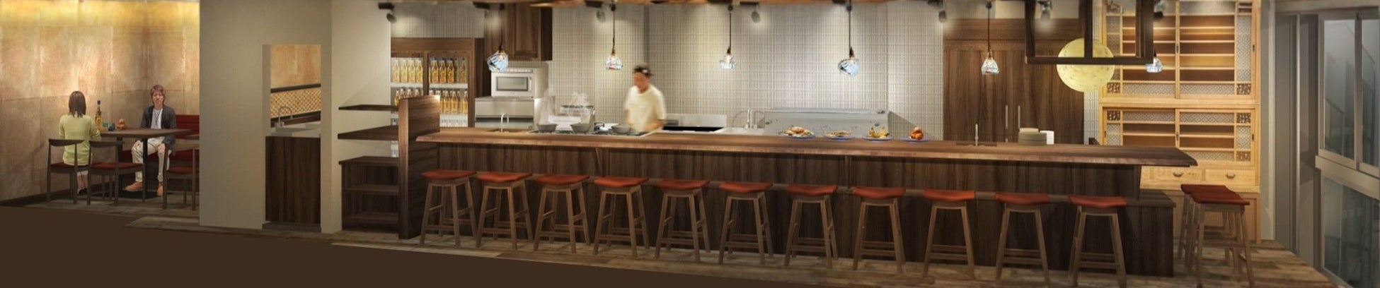 『錦のはりく』は、大切な会食や特別な夜に大人の隠れ家として、会話も美食も堪能できる半個室をご用意しました。カウンター席では、料理人の手さばきを目の前で楽しめる贅沢な特等席となるように設計し、シェフとの距離が近くライブ感のある時間を楽しめます。