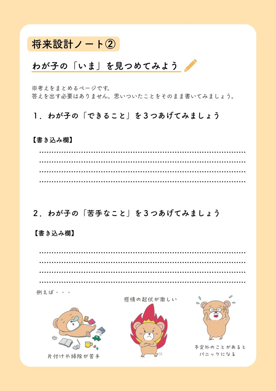 頭の中の不安(生活・お金・制度・居場所)を書き込み式で「見える化」。親自身の心の整理につながる構成。