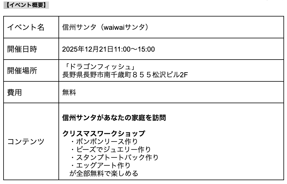 12月21日。サンタが家にも、会場にもやってくる。信州サンタの家庭訪問&無料ワークショップイベントを長野市で開催