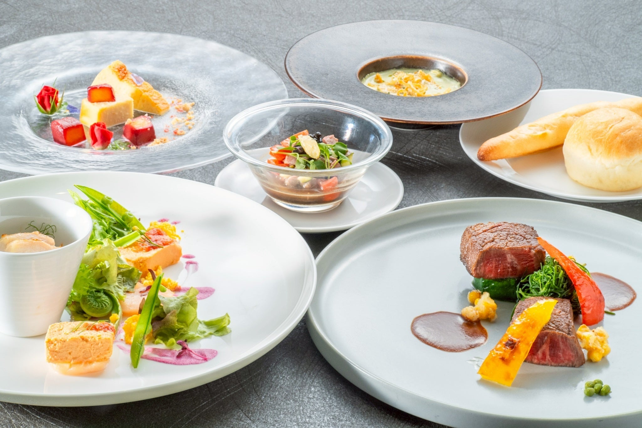 前菜、魚料理、肉料理、デザートなどシェフのこだわりを堪能できる贅沢なコース。