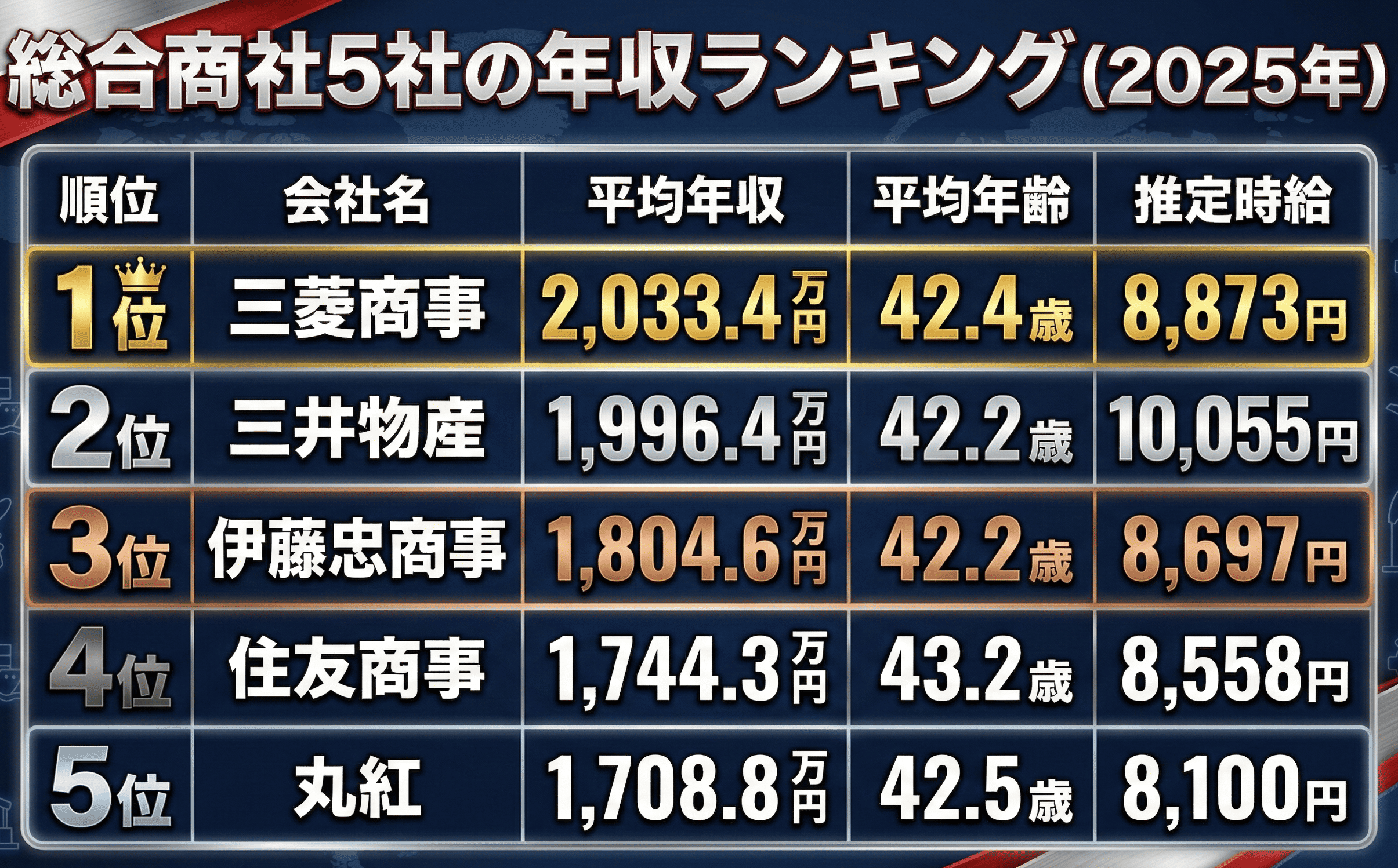 【2025年版】総合商社5社の年収ランキングを公開 ― 時給換算で見えた「稼ぎ方」の違い ―