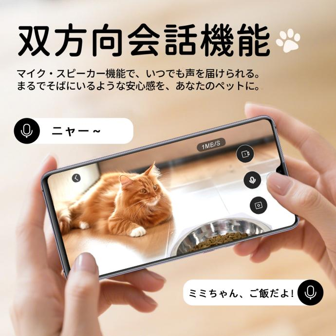 l 遠隔ボイスコミュニケーション&ビデオモニタリング:本製品は双方向通話機能と広角カメラを搭載しており、外出先からでもペットに声をかけたり様子を確認したりすることが可能です。