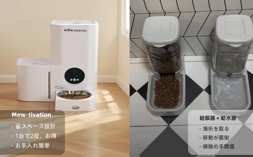 現代の家庭において、空間の有効活用と効率性は極めて重要です。従来のペットケアでは、自動給餌器と循環式給水器をそれぞれ個別に購入する必要があり、機器が増え、スペースを占有し、管理も煩雑でした。