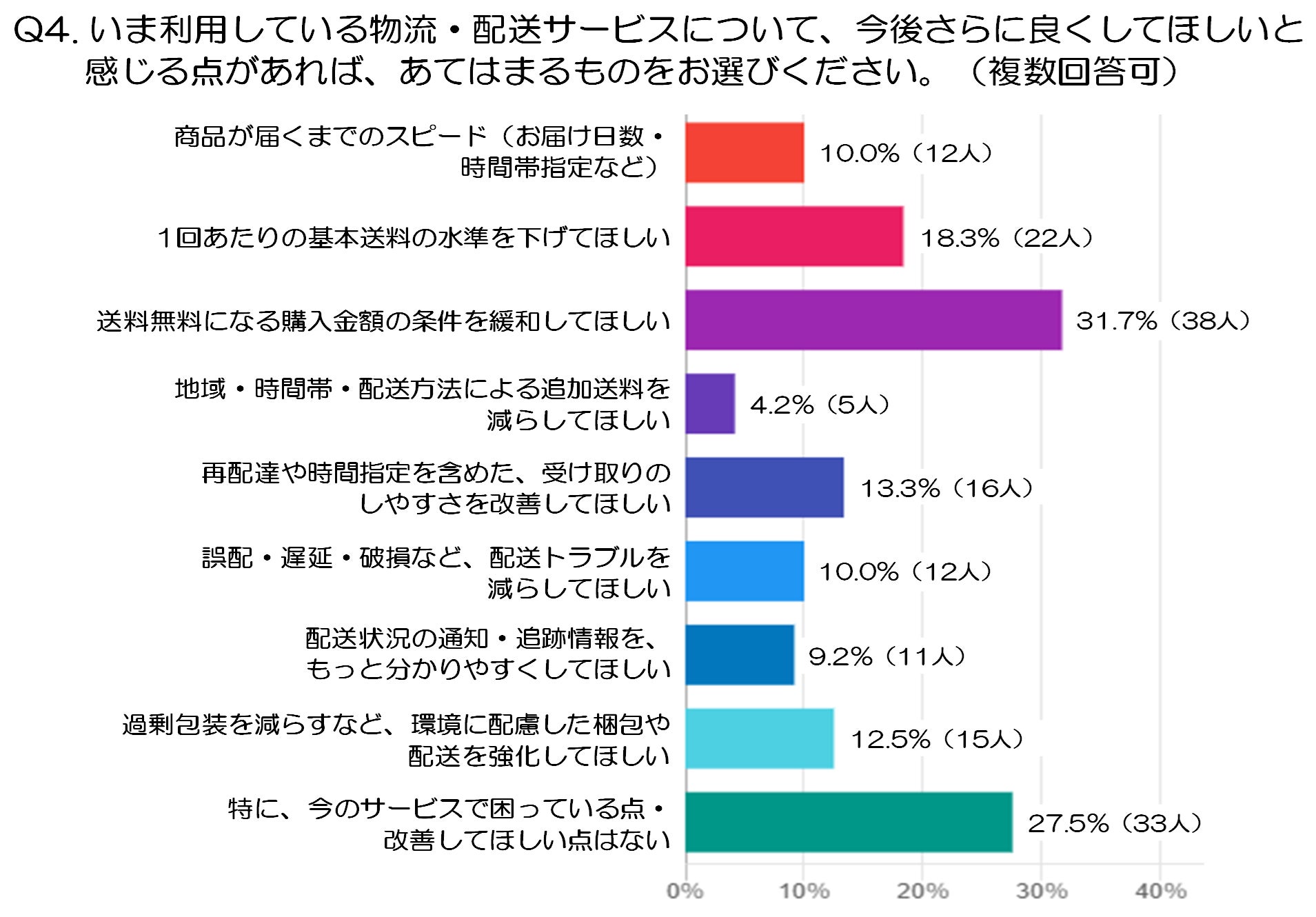 一方で、「特に、今のサービスで困っている点・改善してほしい点はない」と回答した人も27.5%(33人)と一定数存在しています。現状の物流・配送サービスに大きな不満を抱いていない層がいることも、この結果から読み取れます。