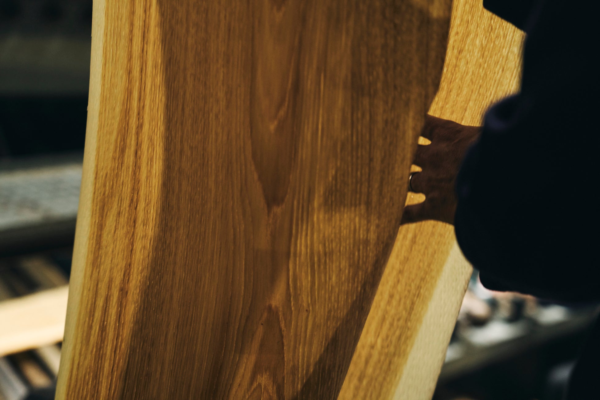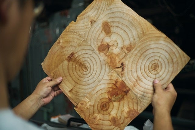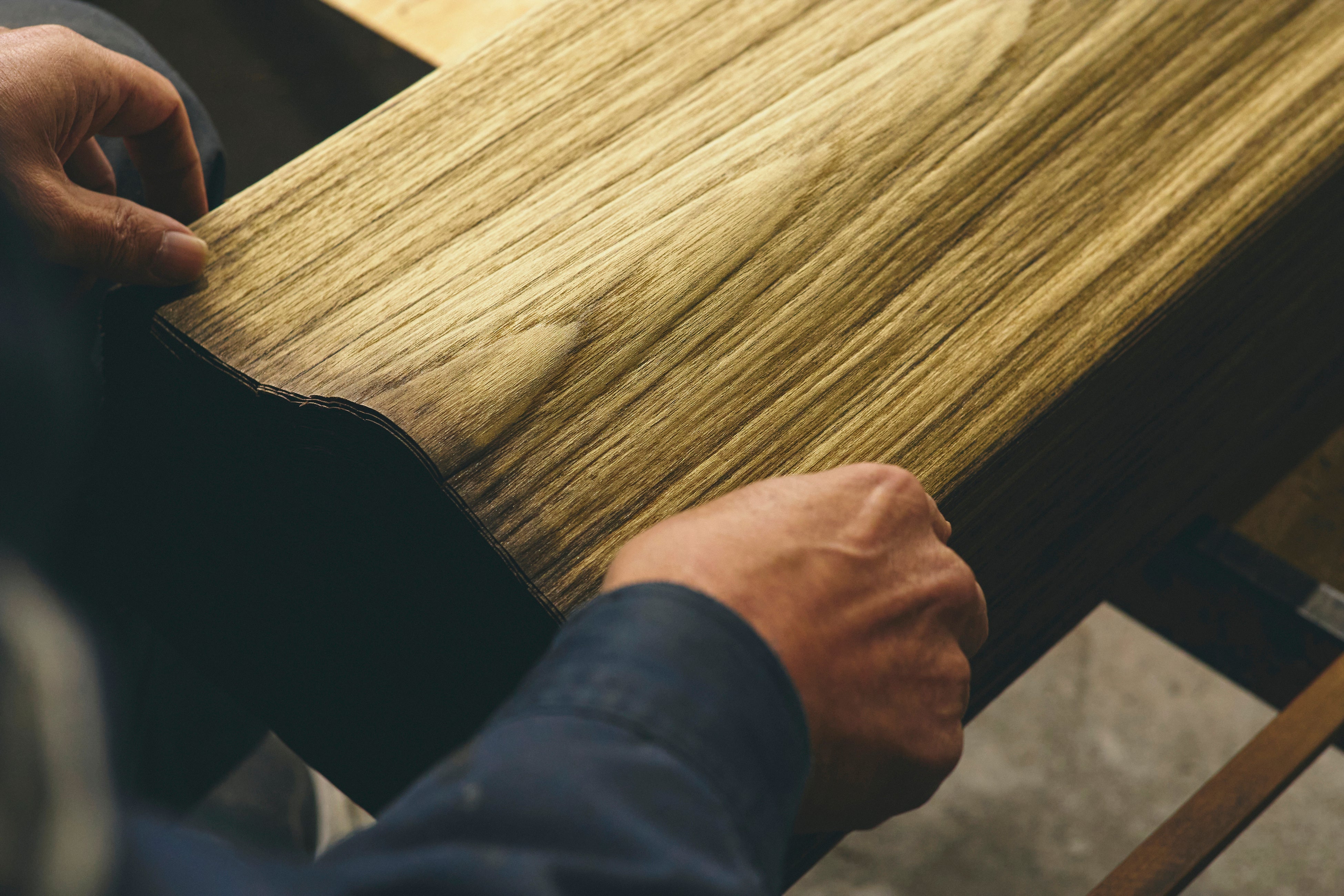 HIROMEIは創業以来、天然木突板の製造を続け、木材を「最後まで使い切る」ことを企業理念として掲げてきました。「Radial Square」はその理念から生まれたプロダクトであり、製材の過程で生じる端材を活かし、職人の手作業によって一点ずつ制作されています。