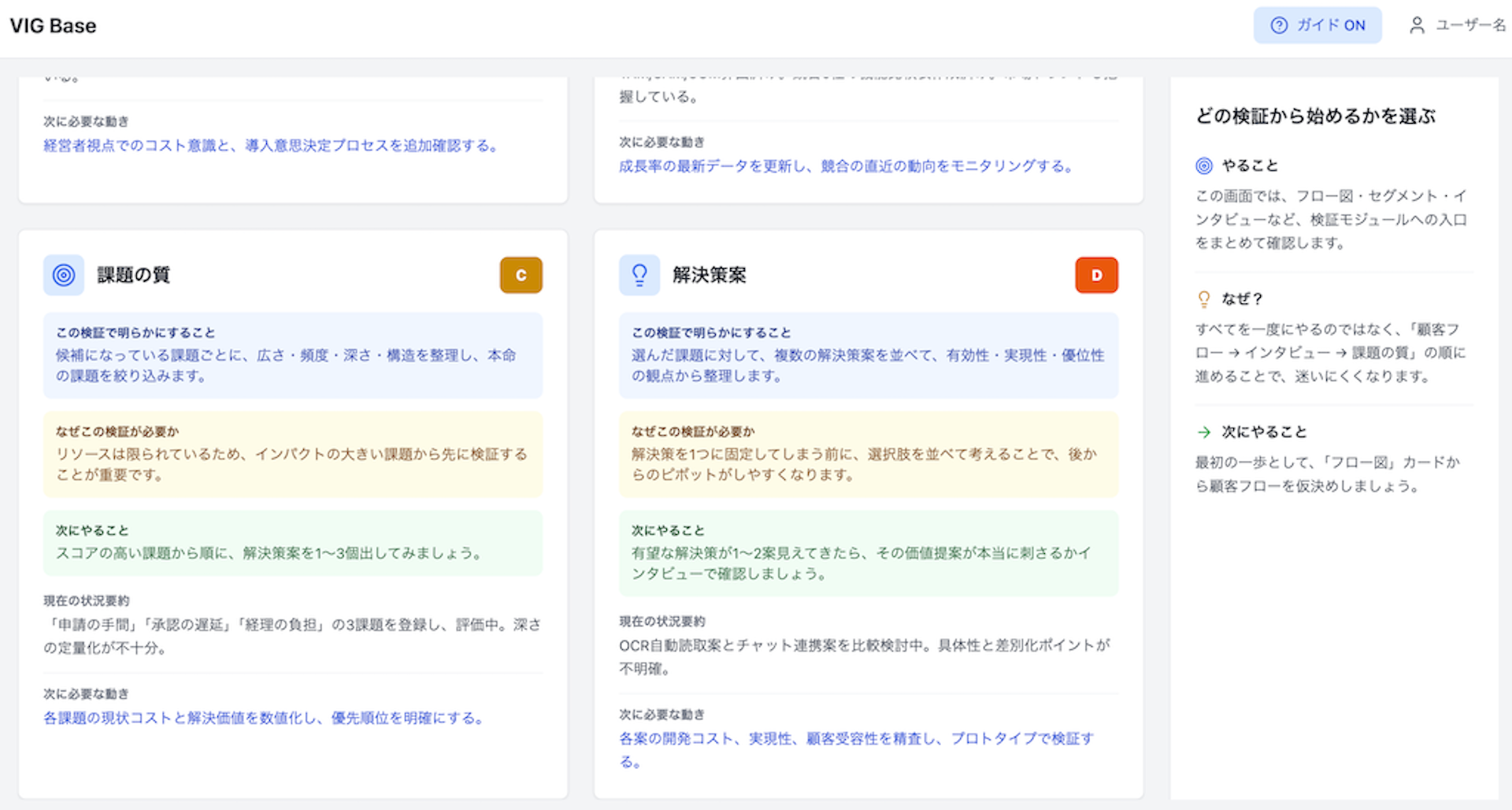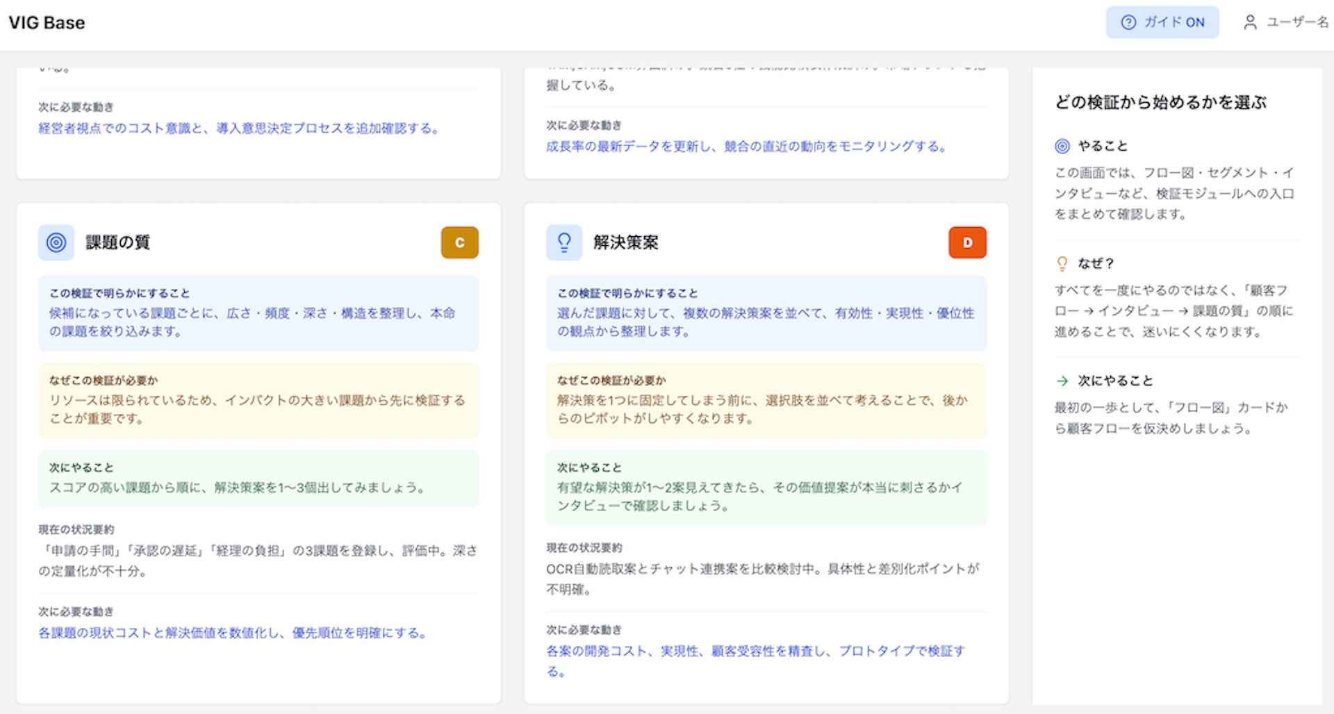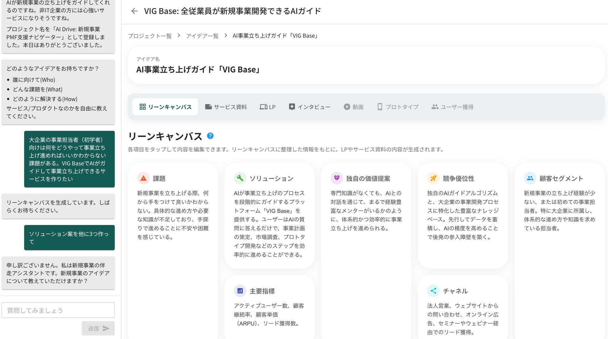 VIG Baseは、事業アイデアを入力すると、顧客構築、顧客インタビュー骨子作成、意思決定、ステージゲート管理まで、AIが常に隣でガイドし、人とAIがプロジェクトを前に進められる事業開発サービスです。