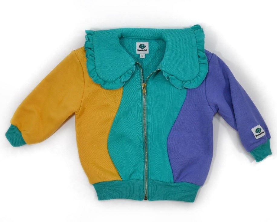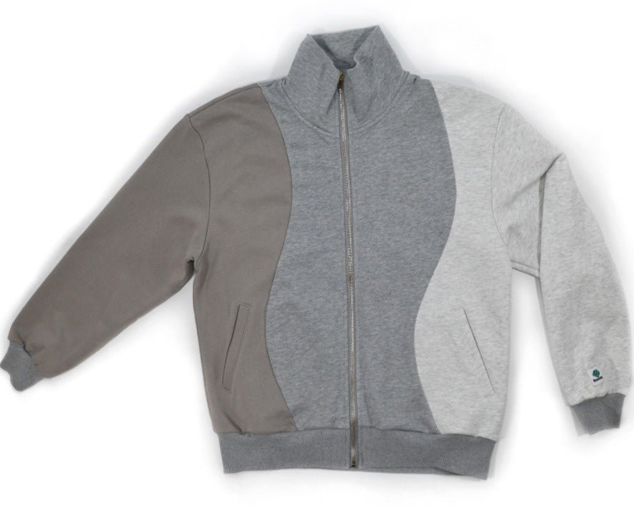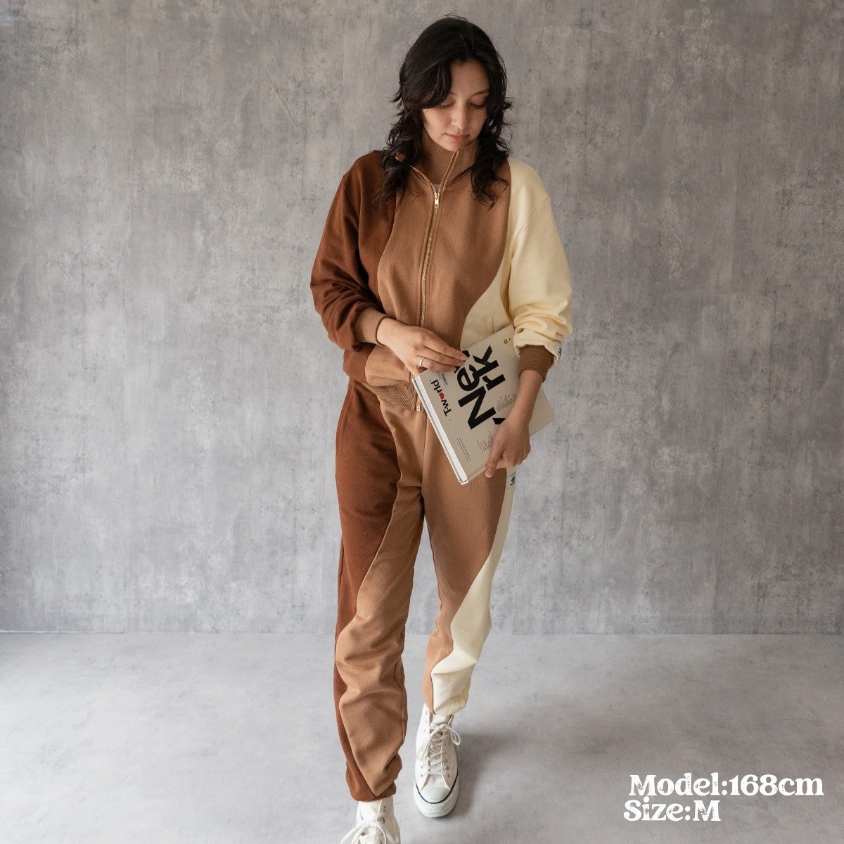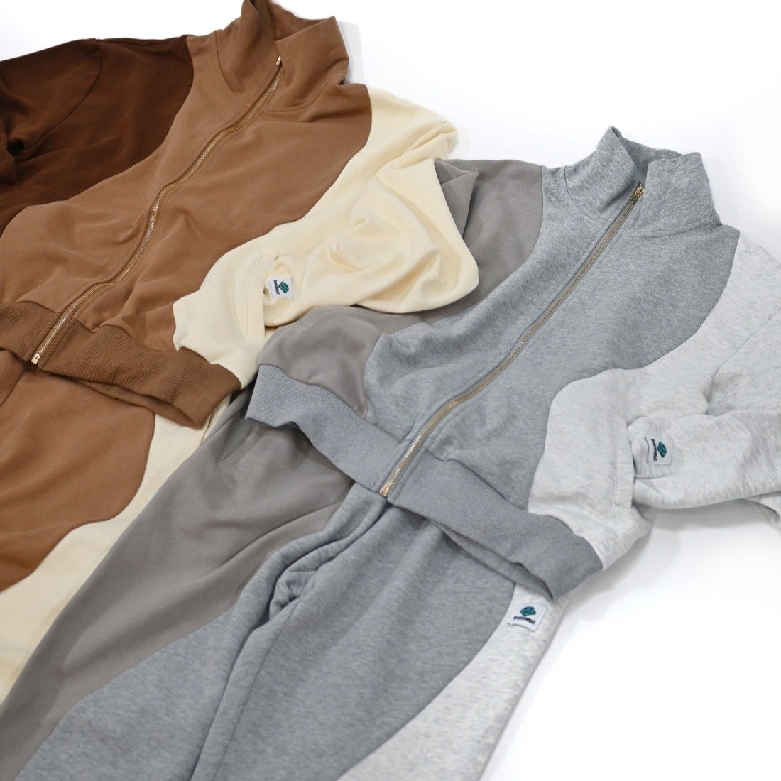 という想いを体現した贅沢に3色のスウェット生地を使用したオリジナリティ溢れるウェーブデザインとフリルの襟が特徴的なスウェットセットアップ。