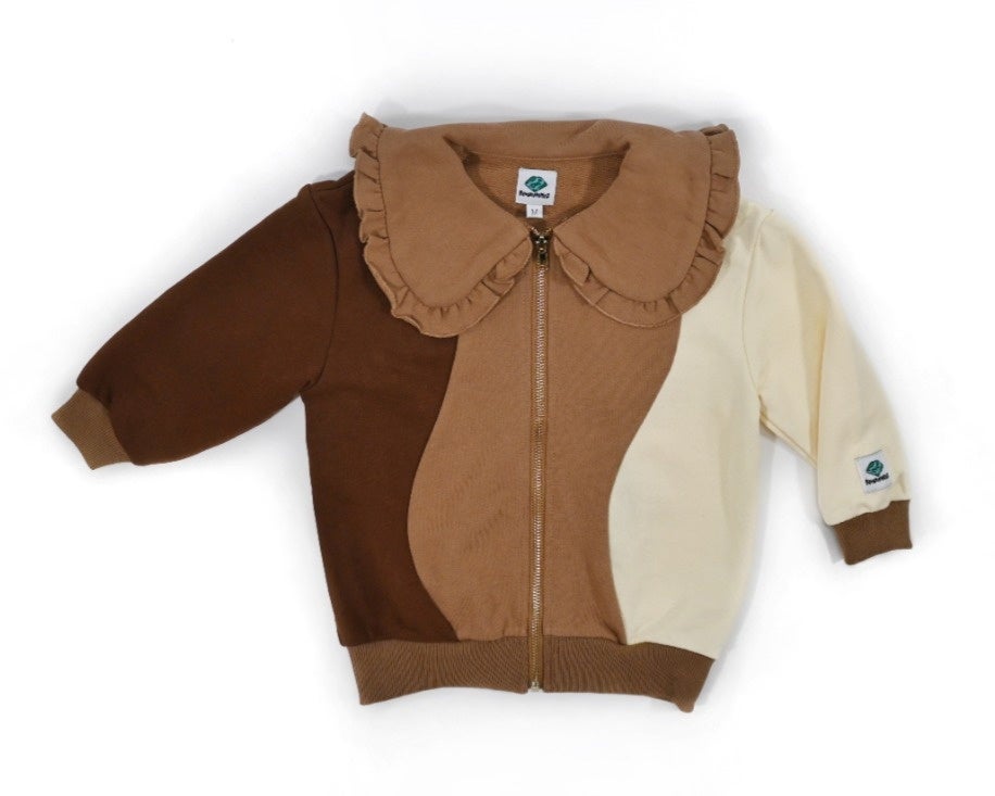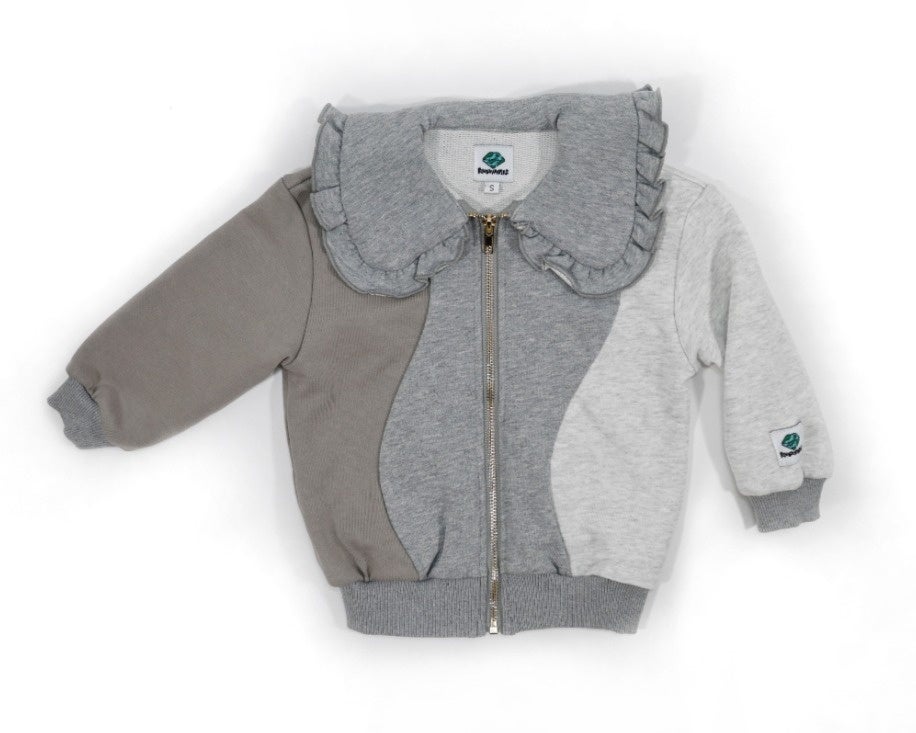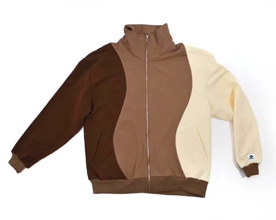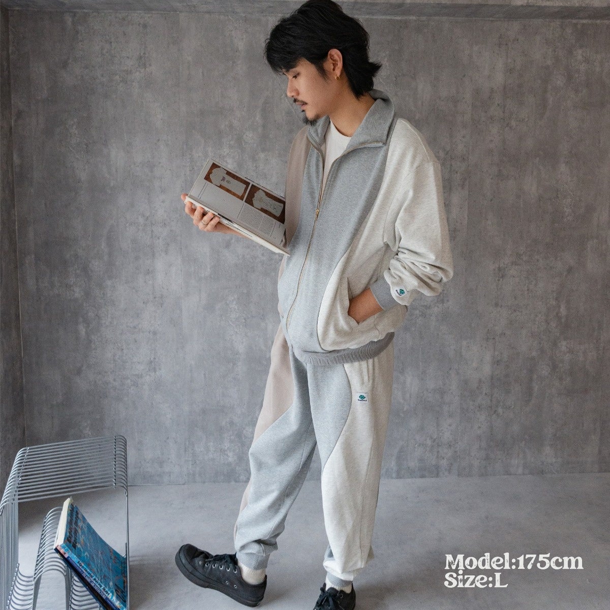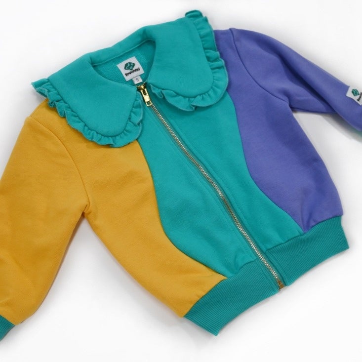 という想いを体現した贅沢に3色のスウェット生地を使用したオリジナリティ溢れるウェーブデザインとフリルの襟が特徴的なスウェットセットアップ。