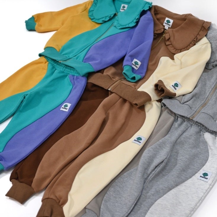 12月19日(金)12時より発売開始!ジェンダーレスなデザインで兄妹や親子でもお揃いができちゃう!カジュアルさもお洒落も忘れたくない贅沢に3色使ったスウェットセットアップ。