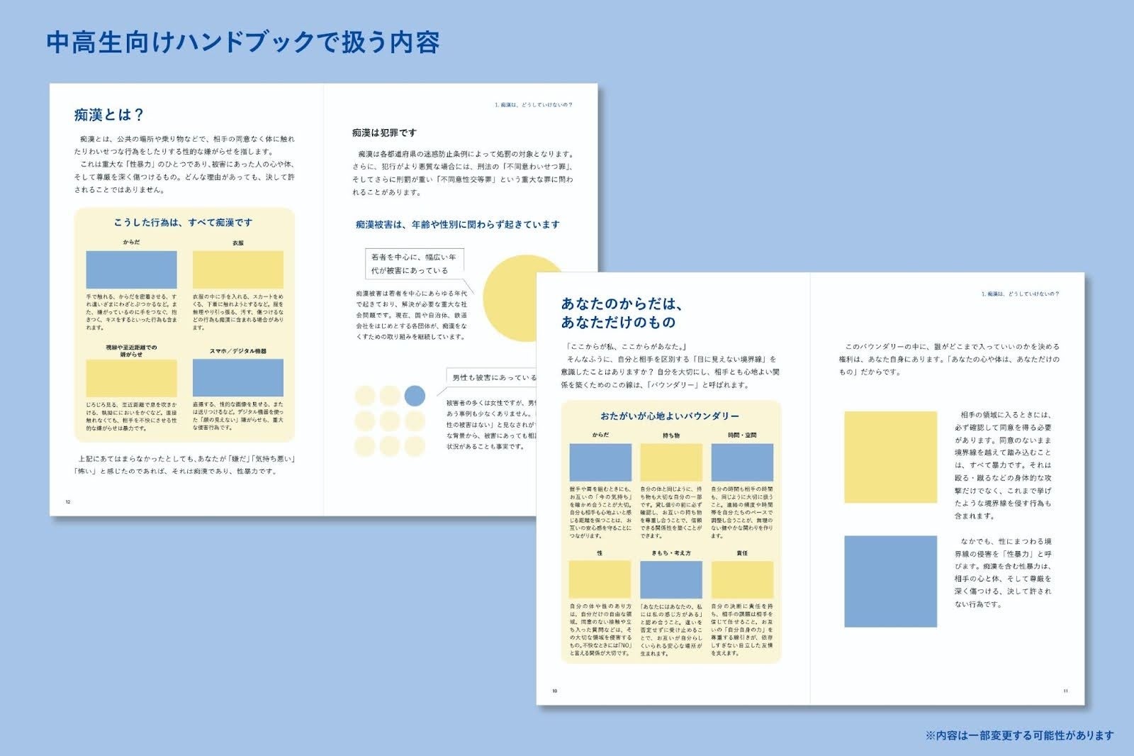 「痴漢は犯罪であり、人権侵害であること。嫌だ、悲しいと感じるのは当たり前のことであること。そして、自分の体について決める権利は自分にあること。このハンドブックが、中高生にとって”お守り”のような存在になることを目指しています。