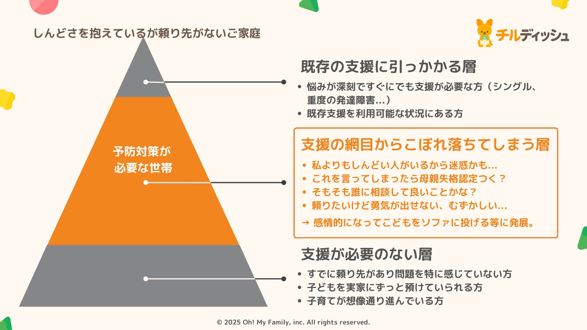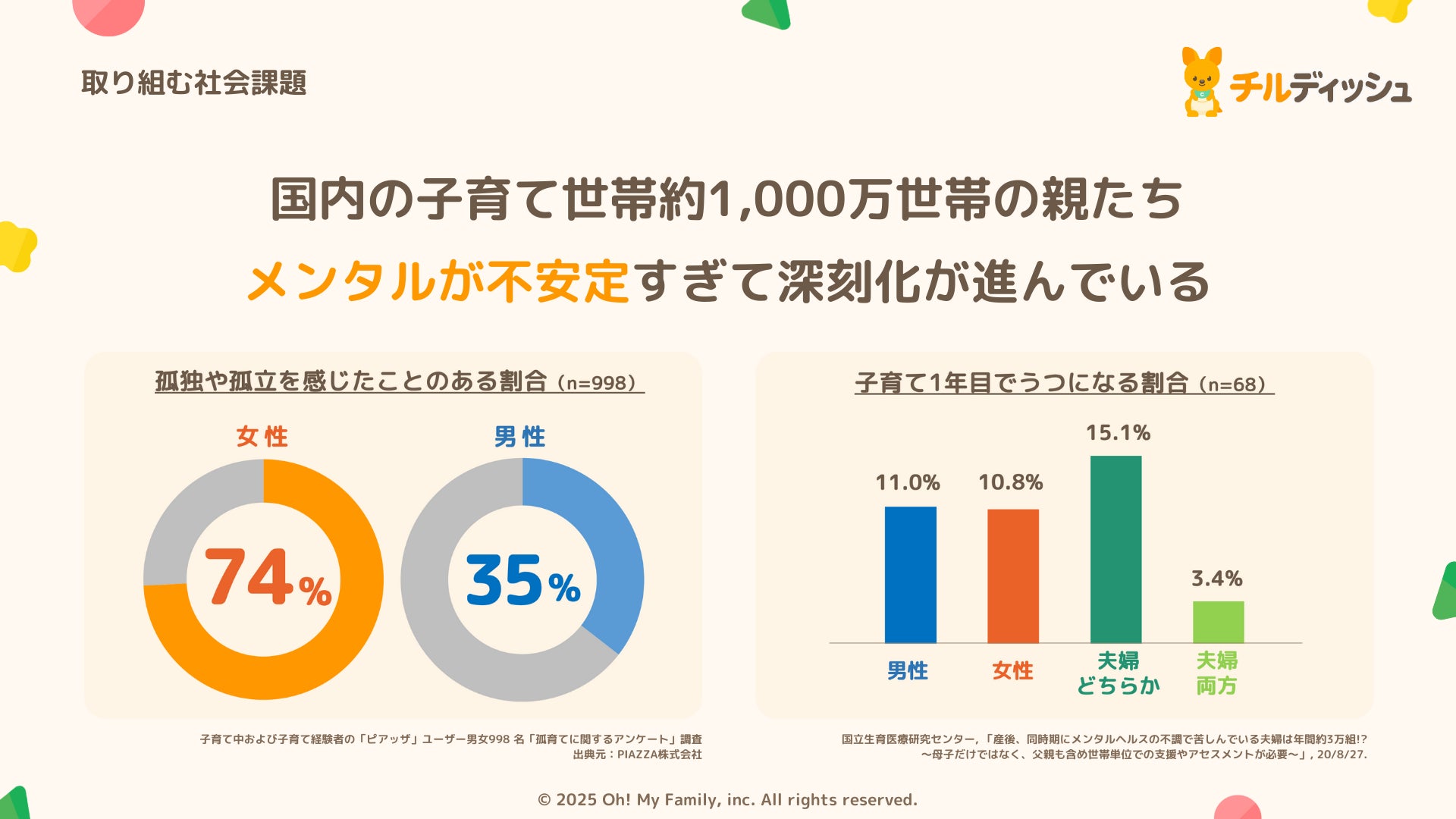 国内外の様々な公的統計/政策文書/査読研究によって、子育て中のパパママの孤独孤立とその深刻化によって、親のメンタルヘルス(周産期うつ/抑うつ)との関連や、虐待リスクの高まりが明らかになっており、令和6年度には「孤独・孤立対策推進法」の策定され、またこども家庭庁では、妊娠期から面談等でニーズを把握し必要な支援につなぐ伴走型相談支援を制度として位置づけられています。
