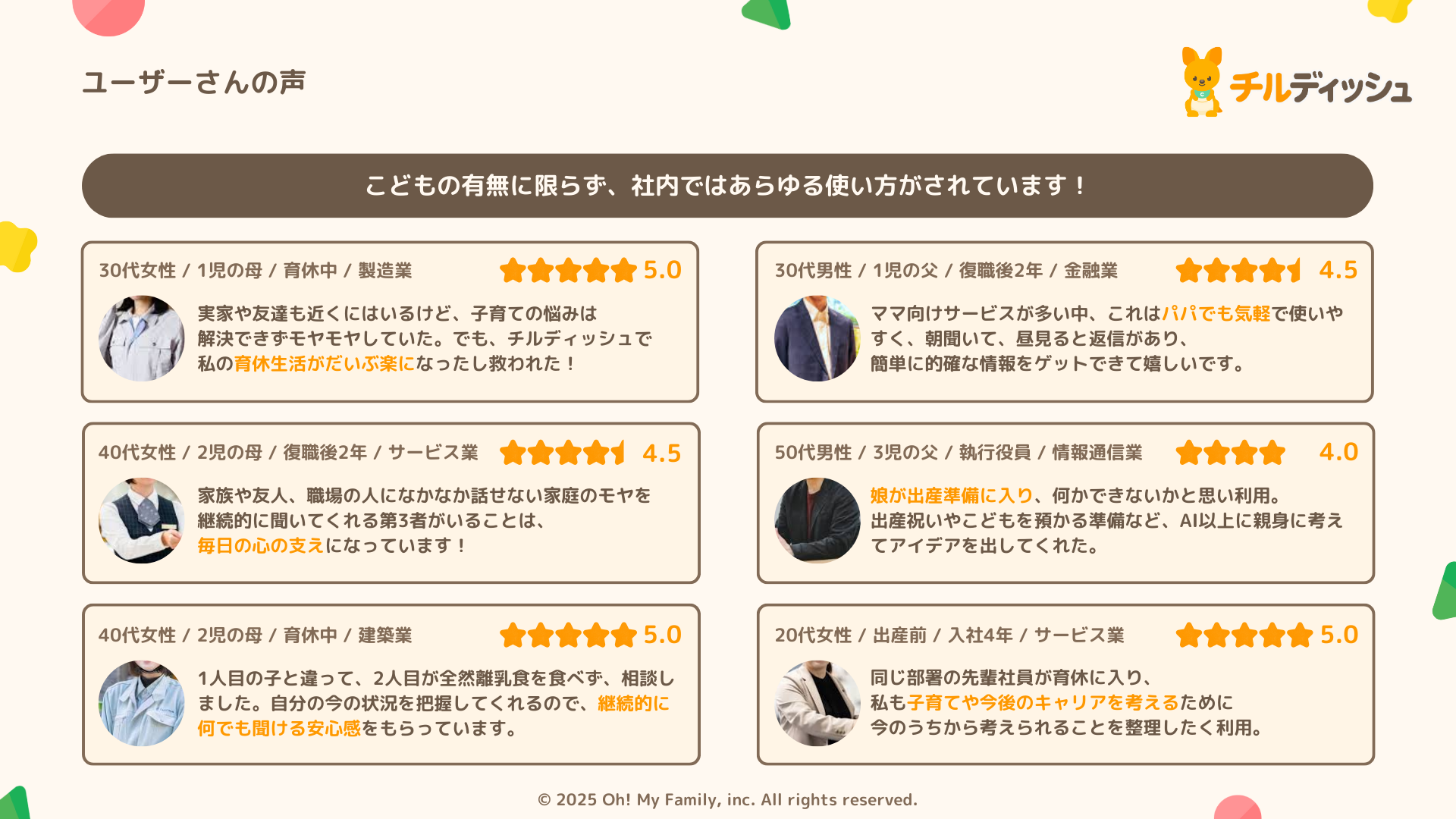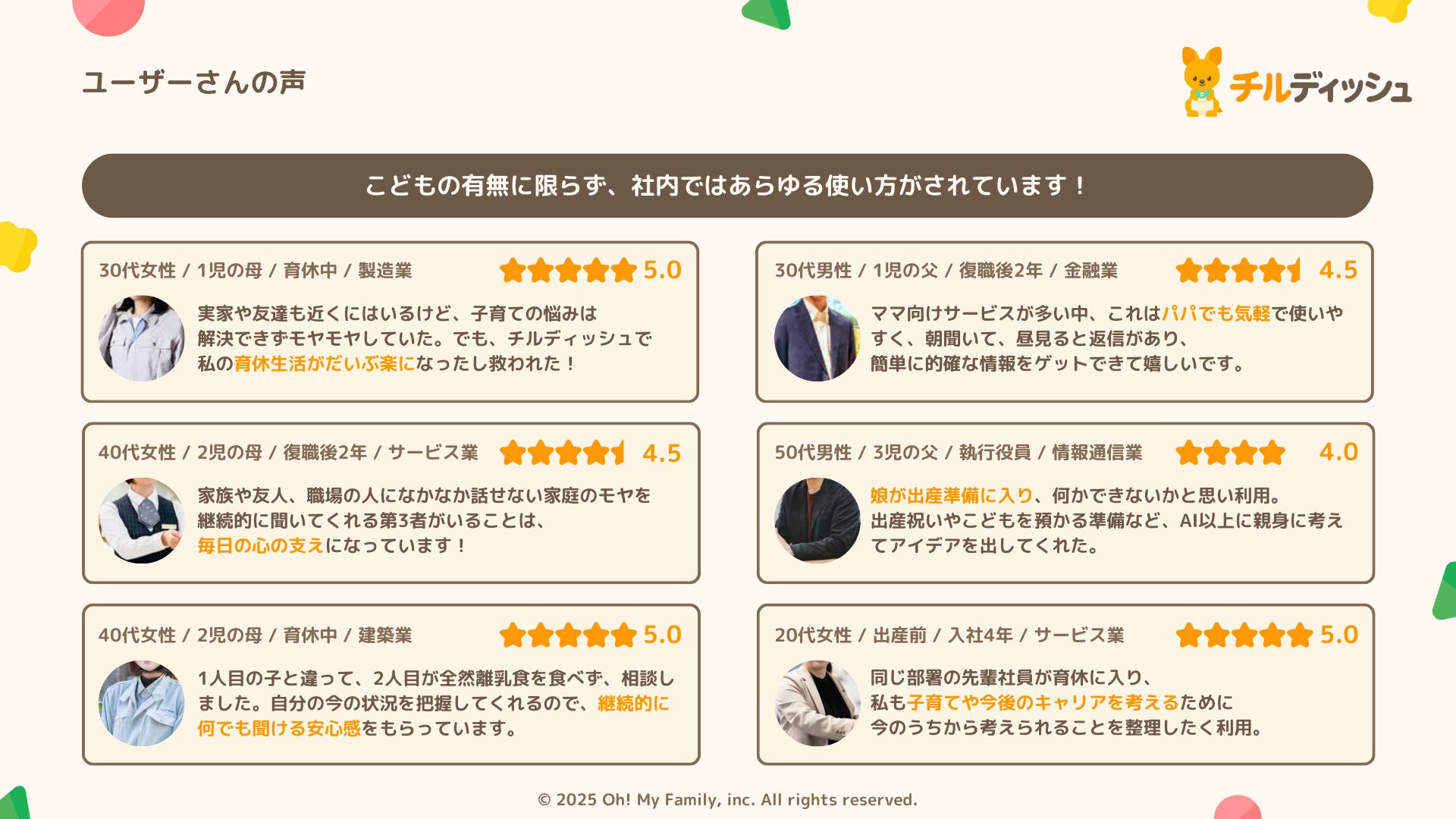 「子育てのお守り」「頼れるママ友ができたみたい」「程よい距離感で頼りやすい」「子育てや今後のキャリアについて、夫婦のモヤモヤなど何でも相談できて心強い」などの嬉しいお声をいただいています。