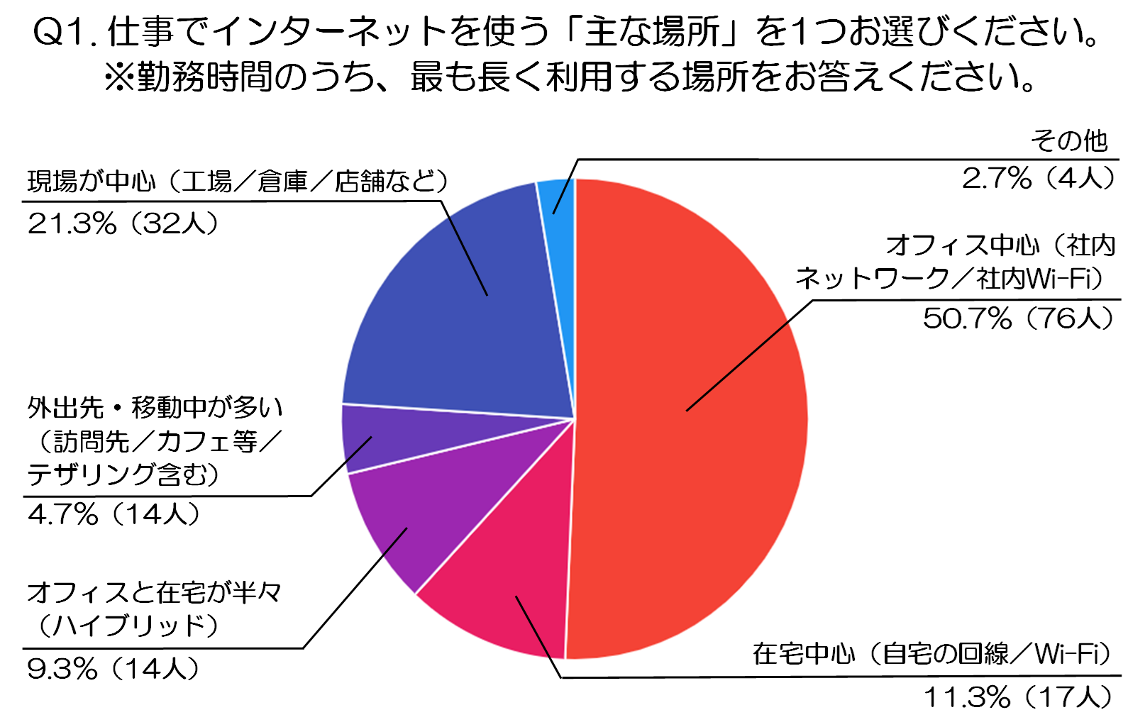 一方、「外出先・移動中が多い(訪問先/カフェ等/テザリング含む)」は4.7%(7人)にとどまりました。安定した通信環境を確保しにくい働き方は限定的であり、多くの人が比較的固定された場所でインターネットを利用していることが分かります。