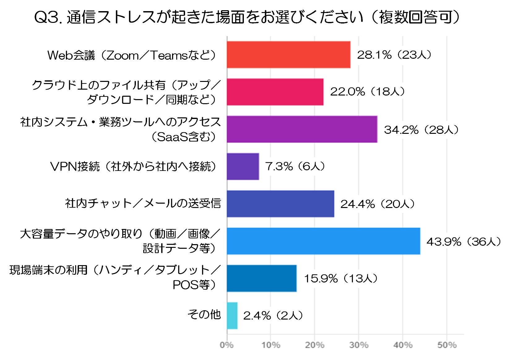 最も多く挙げられたのは「大容量データのやり取り(動画/画像/設計データ等)」で、43.9%(36人)でした。ファイルサイズが大きくなるほど通信速度や安定性の影響を受けやすく、アップロードやダウンロードの遅延が、そのまま作業の停滞や待ち時間につながっている様子がうかがえます。