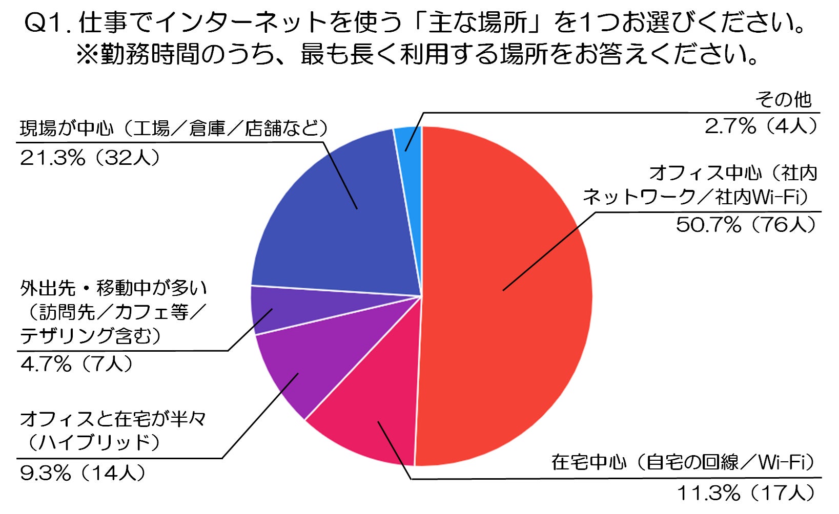 次いで「現場が中心(工場/倉庫/店舗など)」が21.3%(32人)となり、オフィス以外の場所でもインターネットを活用しながら業務を行う層が一定数存在することが分かります。必ずしもデスクワークに限られない働き方が広がっている点は、この結果からも読み取れます。