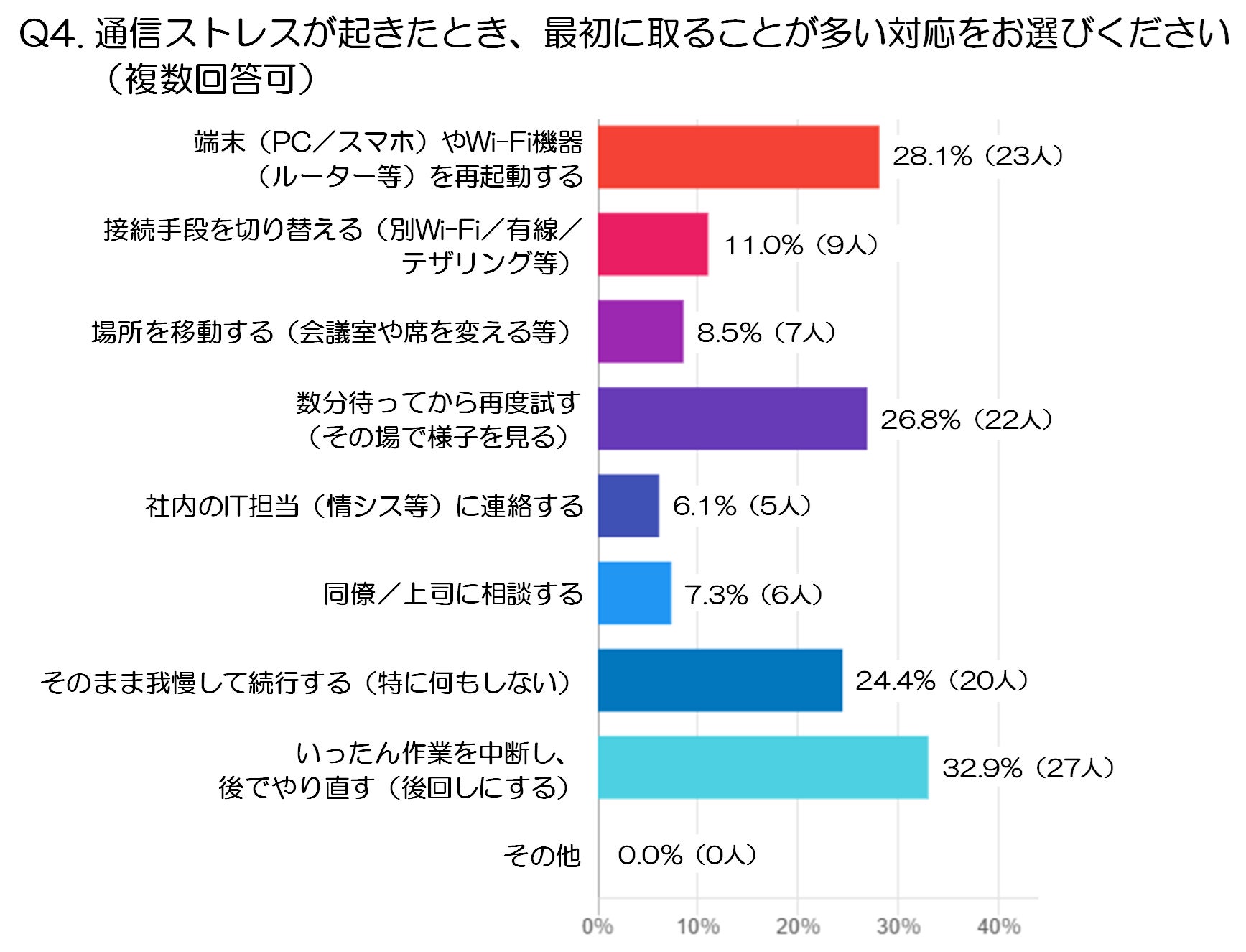 「接続手段を切り替える(別Wi-Fi/有線/テザリング等)」は11.0%(9人)、「場所を移動する(会議室や席を変える等)」は8.5%(7人)にとどまりました。環境を大きく変える対応は、手間や制約の面から、初動としては選ばれにくい傾向があると考えられます。