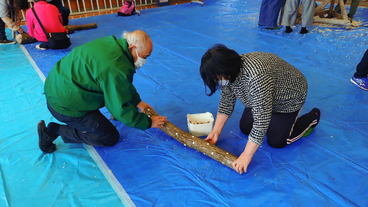 森のめぐみの1つ、しいたけはどうやってできているのかな?しいたけ原木の駒打ちを体験して、美味しいしいたけをゲットしよう!