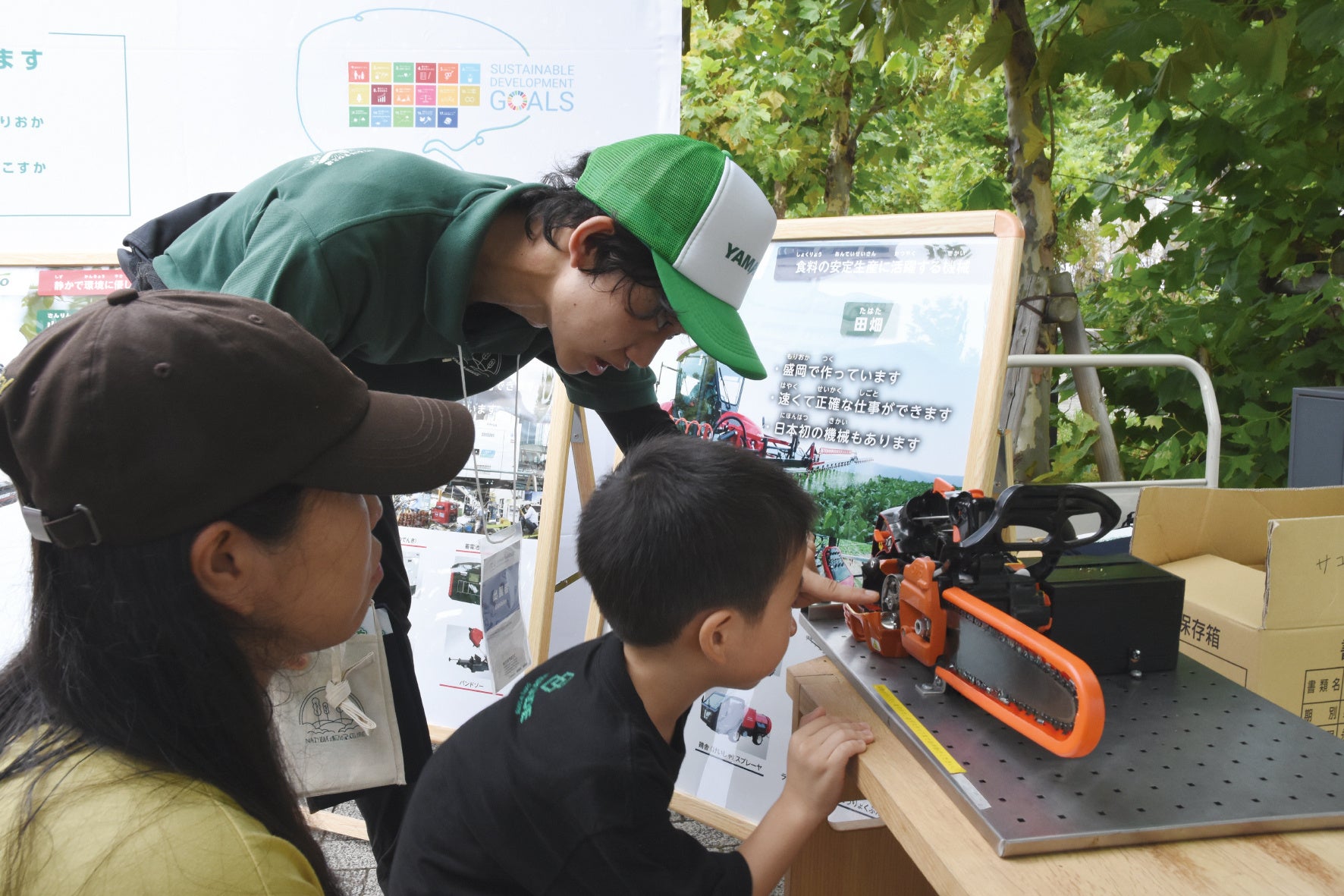 チェンソーメーカーによる展示・体験ブース。チェンソーだけでなく、様々な機材を実際に手に取って見ることができます。本物の道具に触れて林業の世界を体感しよう!
