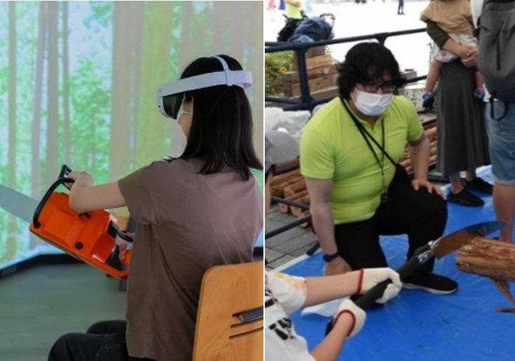 最新のVR機器や本物の丸太やのこぎりを使った林業体験。リアルとヴァーチャルの両方を体感して、君が未来の林業技術者だ!