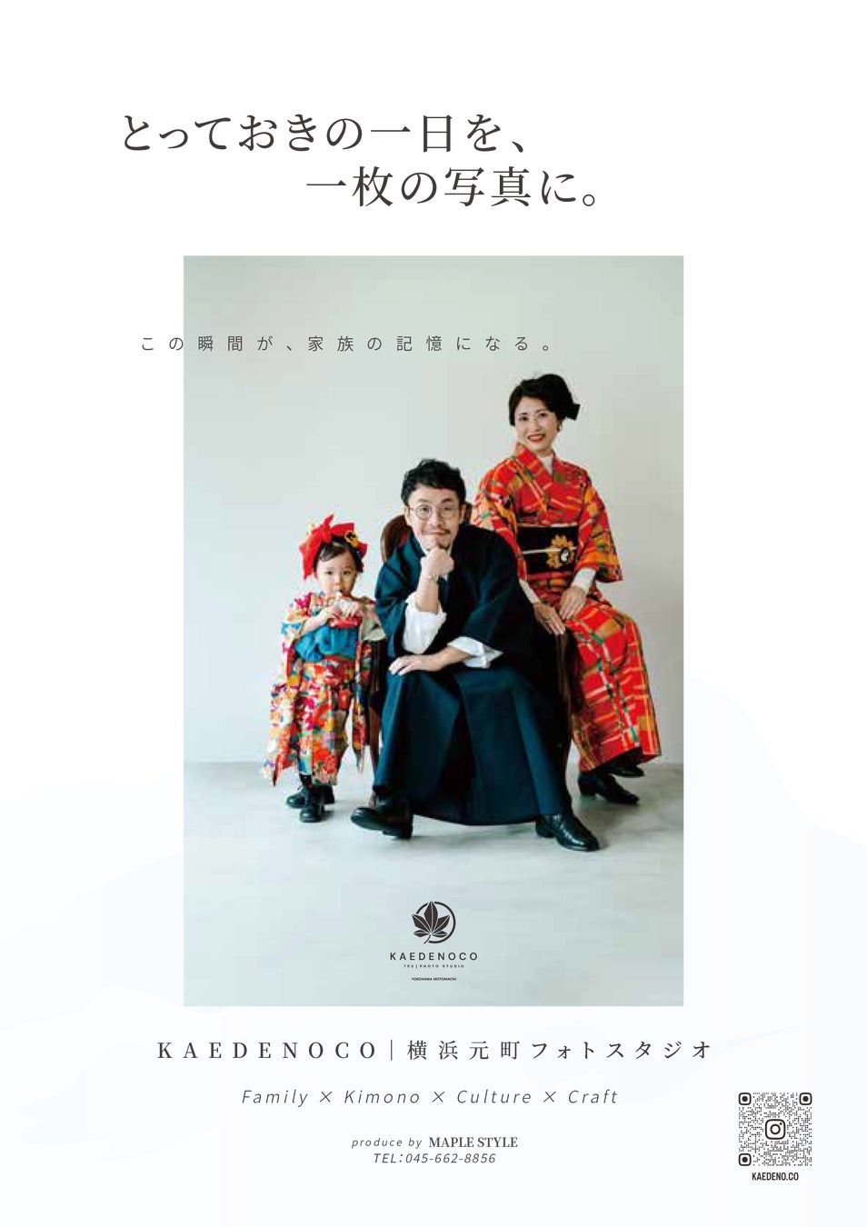 KAEDENOCOは、和装の美しさと家族の絆を、写真という形で未来に残すフォトスタジオです。
