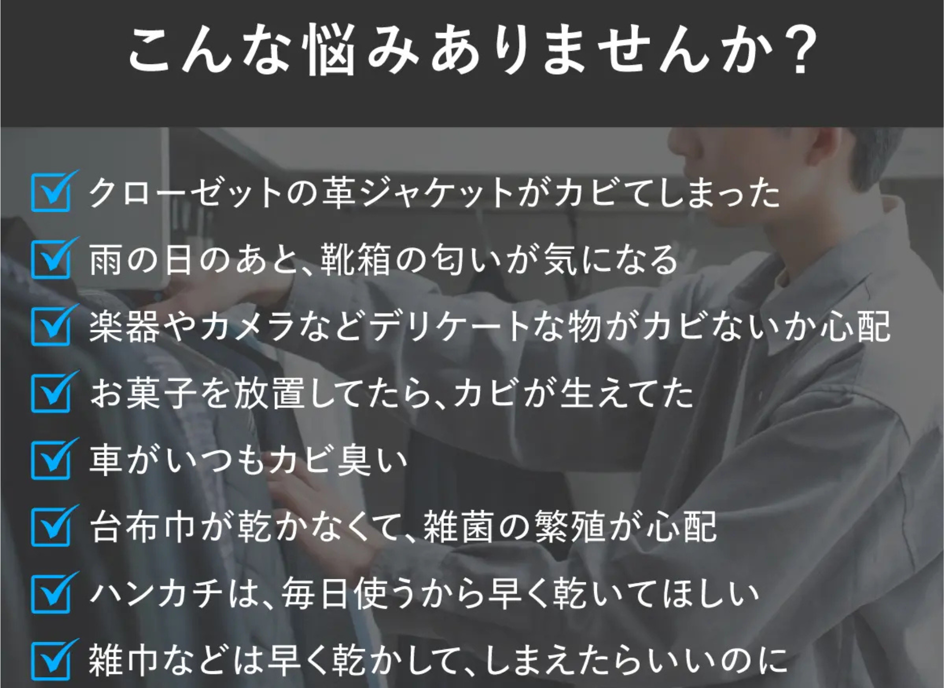 クローゼットの衣類のカビ、靴箱や車内のこもった臭い、部屋干し洗濯物の乾きにくさなど、湿気は私たちの暮らしの質を大きく左右します。