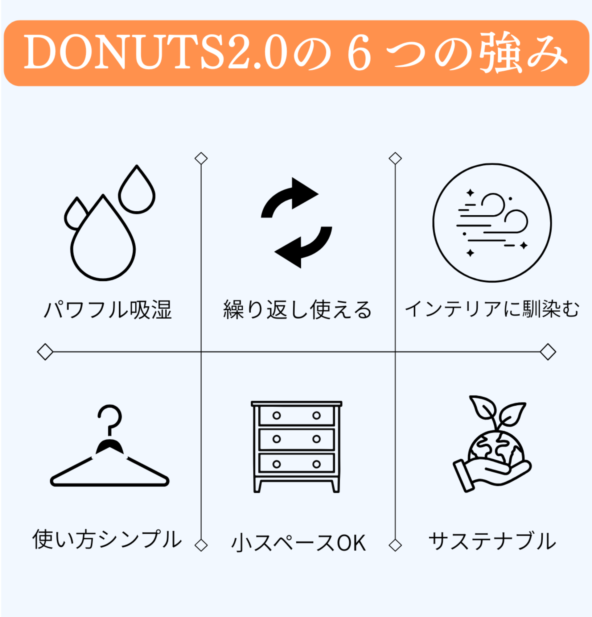 こうした課題に対し、「DONUTS除湿器2.0」は、手軽かつ継続的な湿気対策を可能にします。