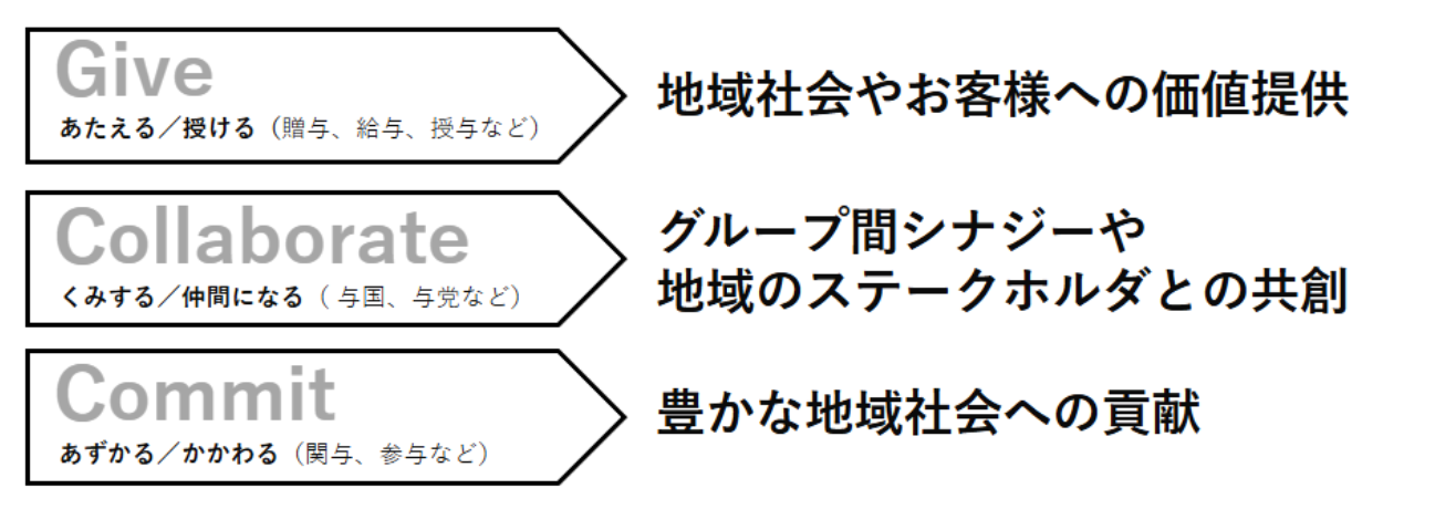 「與」という文字は「与える・与する・与る」、「くみする、仲間になる」、「あずかる、かかわる」という意味を持っており、それぞれ「地域社会やお客様への価値提供」、「グループ間シナジーや地域のステークホルダーとの共創」、「豊かな地域社会への貢献」と解釈できると考えております。