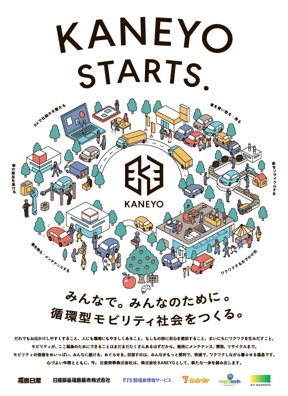 福島日産自動車株式会社(以下、「福島日産」)代表取締役社長の金子與志幸は、事業管理会社「日産商事株式会社」を2026年1月5日(月)付けで、社名を「株式会社KANEYO」に変更いたします。福島日産、日産部品福島販売株式会社、株式会社福島情報サービス、カーセブン郡山香久池店、株式会社ナプロアース、株式会社EV GARDENが「新生KANEYOグループ」として、だれでもお出かけしやすく、人にも環境にもやさしい、もしもの時に安心を提供し、まいにちにワクワクを生みだす循環型モビリティ社会の実現を目指し、スタートいたします。